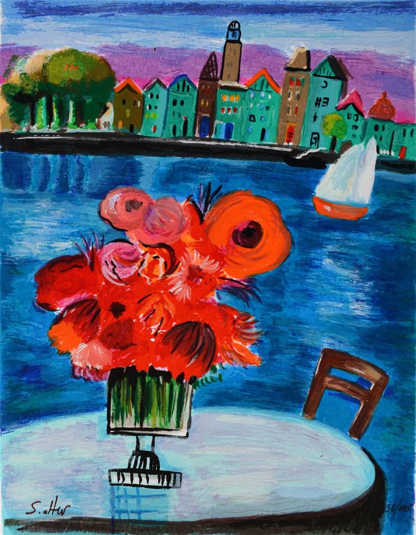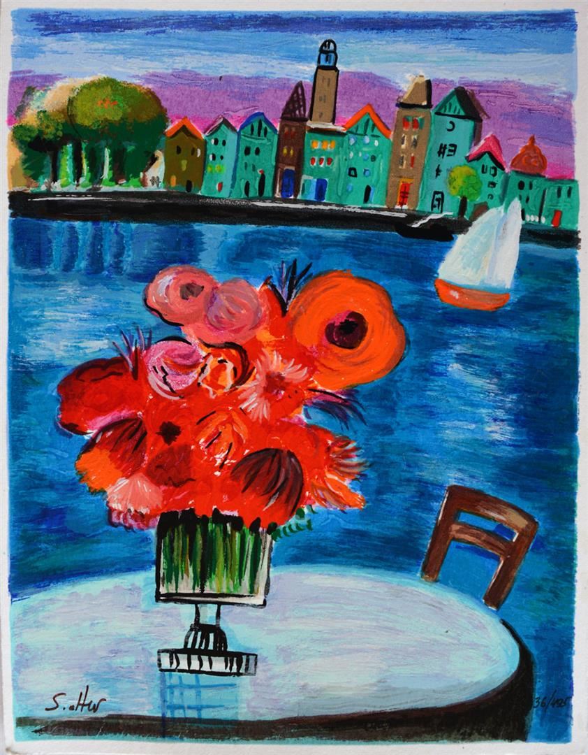 Artist: Shlomo Alter - Title: Untitled - Medium: Serigraph on Fine Art Paper - Signature: Hand-signed by the Artist - Limited Edition: 495 - Paper Size: Approximately 12.25 inches x 9.75 inches - Framed: Unframed - Details: This work comes with a Certificate of Authenticity - Biography: Shlomo Alter was born in Romania to a family of restaurateurs. He emigrated to Israel in 1948 and during high school he started to study painting under the well known artist Aaron Avni. Some of his early works appeared in UNICEF'S world touring exhibition of young artists. Altar's works are influenced by his early recollections of the well dressed people who gathered in the courtyard of his parent's restaurant in Bucharest to eat and drink, to dance of Gypsy bands, and to enjoy the convivial atmosphere. With a touch of optimism and good humor Alter's art reflects life at its core, an antithesis to the Nazi regime that shattered his childhood happiness. His paintings are like stage set on which the objects relate to each other through a glow of colors and lines - a frozen moment in time, a dynamic stillness prior to a burst of action. His style can best be compared to that of the Expressionists. He uses color to give direct expression to his ideas in influence by the famous, particularly Matisse and Duty.
