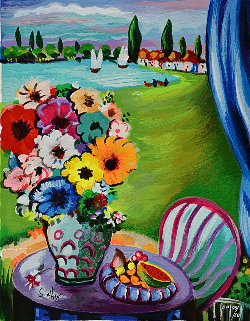 Artist: Shlomo Alter - Title: Breakfast by the Lake - Medium: Serigraph on Fine Art Paper - Signature: Hand-signed by the Artist - Limited Edition: AP 50 - Paper Size: Approximately 12.25 inches x 9.5 inches - Framed: Unframed - Details: This work comes with a Certificate of Authenticity - Biography: Shlomo Alter was born in Romania to a family of restaurateurs. He emigrated to Israel in 1948 and during high school he started to study painting under the well known artist Aaron Avni. Some of his early works appeared in UNICEF'S world touring exhibition of young artists. Altar's works are influenced by his early recollections of the well dressed people who gathered in the courtyard of his parent's restaurant in Bucharest to eat and drink, to dance of Gypsy bands, and to enjoy the convivial atmosphere. With a touch of optimism and good humor Alter's art reflects life at its core, an antithesis to the Nazi regime that shattered his childhood happiness. His paintings are like stage set on which the objects relate to each other through a glow of colors and lines - a frozen moment in time, a dynamic stillness prior to a burst of action. His style can best be compared to that of the Expressionists. He uses color to give direct expression to his ideas in influence by the famous, particularly Matisse and Duty.