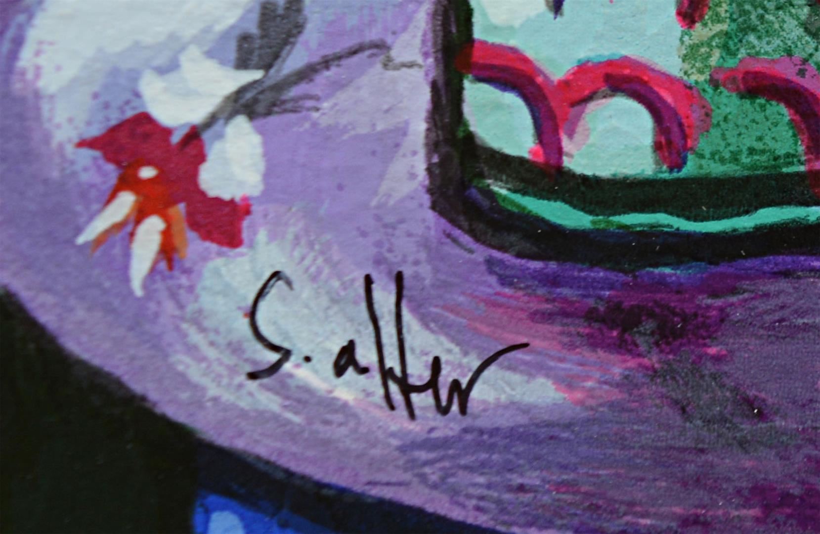 Artist: Shlomo Alter - Title: Breakfast by the Lake - Medium: Serigraph on Fine Art Paper - Signature: Hand-signed by the Artist - Limited Edition: AP 50 - Paper Size: Approximately 12.25 inches x 9.5 inches - Framed: Unframed - Details: This work comes with a Certificate of Authenticity - Biography: Shlomo Alter was born in Romania to a family of restaurateurs. He emigrated to Israel in 1948 and during high school he started to study painting under the well known artist Aaron Avni. Some of his early works appeared in UNICEF'S world touring exhibition of young artists. Altar's works are influenced by his early recollections of the well dressed people who gathered in the courtyard of his parent's restaurant in Bucharest to eat and drink, to dance of Gypsy bands, and to enjoy the convivial atmosphere. With a touch of optimism and good humor Alter's art reflects life at its core, an antithesis to the Nazi regime that shattered his childhood happiness. His paintings are like stage set on which the objects relate to each other through a glow of colors and lines - a frozen moment in time, a dynamic stillness prior to a burst of action. His style can best be compared to that of the Expressionists. He uses color to give direct expression to his ideas in influence by the famous, particularly Matisse and Duty.