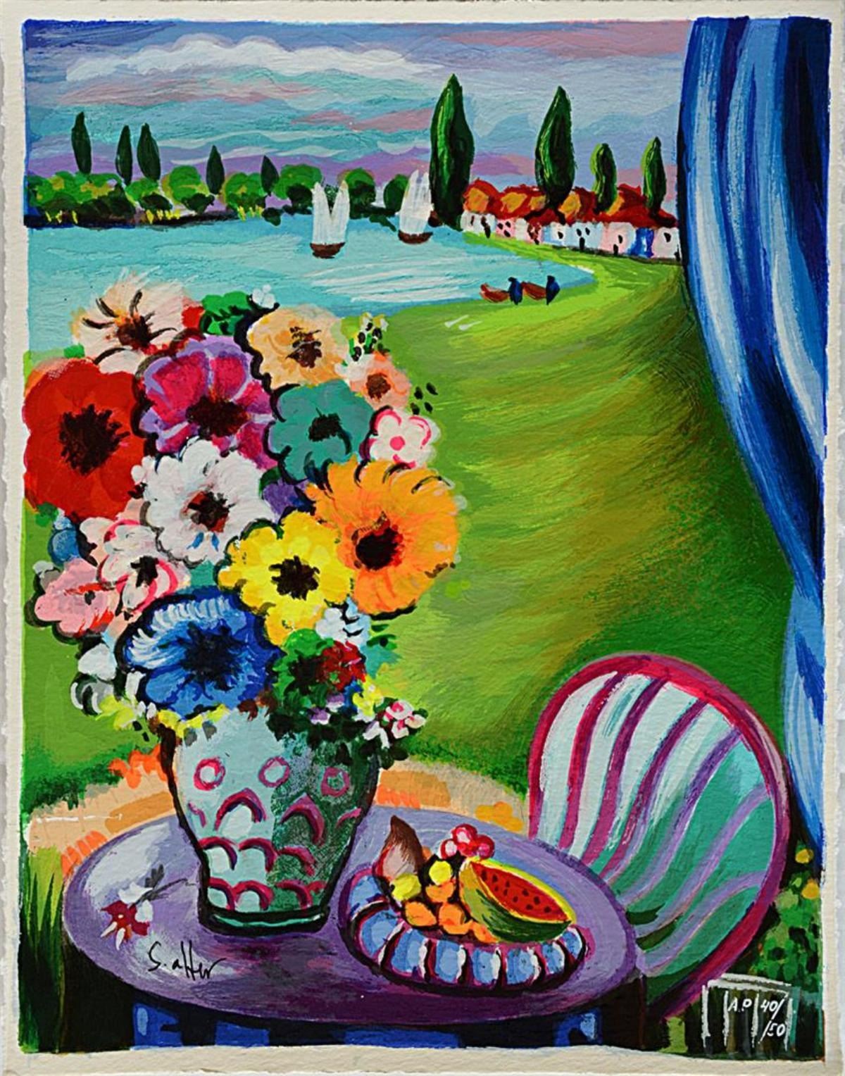Artist: Shlomo Alter - Title: Breakfast by the Lake - Medium: Serigraph on Fine Art Paper - Signature: Hand-signed by the Artist - Limited Edition: AP 50 - Paper Size: Approximately 12.25 inches x 9.5 inches - Unframed - Details: This work comes with a Certificate of Authenticity - Biography: Shlomo Alter was born in Romania to a family of restaurateurs. He emigrated to Israel in 1948 and during high school he started to study painting under the well known artist Aaron Avni. Some of his early works appeared in UNICEF'S world touring exhibition of young artists. Altar's works are influenced by his early recollections of the well dressed people who gathered in the courtyard of his parent's restaurant in Bucharest to eat and drink, to dance of Gypsy bands, and to enjoy the convivial atmosphere. With a touch of optimism and good humor Alter's art reflects life at its core, an antithesis to the Nazi regime that shattered his childhood happiness. His paintings are like stage set on which the objects relate to each other through a glow of colors and lines - a frozen moment in time, a dynamic stillness prior to a burst of action. His style can best be compared to that of the Expressionists. He uses color to give direct expression to his ideas in influence by the famous, particularly Matisse and Duty.