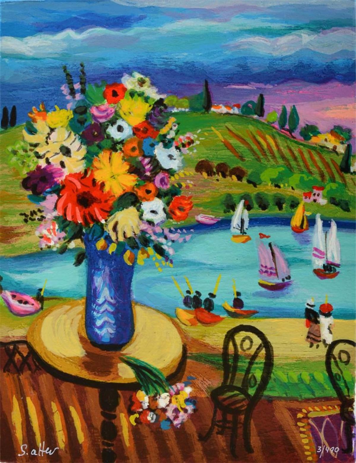 Artist: Shlomo Alter - Title: Flowers on the Table - Medium: Serigraph on Fine Art Paper - Signature: Hand-signed by the Artist - Limited Edition: 490 - Paper Size: Approximately 12.5 inches x 10 inches - Framed: Unframed - Details: This work comes with a Certificate of Authenticity - Biography: Shlomo Alter was born in Romania to a family of restaurateurs. He emigrated to Israel in 1948 and during high school he started to study painting under the well known artist Aaron Avni. Some of his early works appeared in UNICEF'S world touring exhibition of young artists. Altar's works are influenced by his early recollections of the well dressed people who gathered in the courtyard of his parent's restaurant in Bucharest to eat and drink, to dance of Gypsy bands, and to enjoy the convivial atmosphere. With a touch of optimism and good humor Alter's art reflects life at its core, an antithesis to the Nazi regime that shattered his childhood happiness. His paintings are like stage set on which the objects relate to each other through a glow of colors and lines - a frozen moment in time, a dynamic stillness prior to a burst of action. His style can best be compared to that of the Expressionists. He uses color to give direct expression to his ideas in influence by the famous, particularly Matisse and Duty.