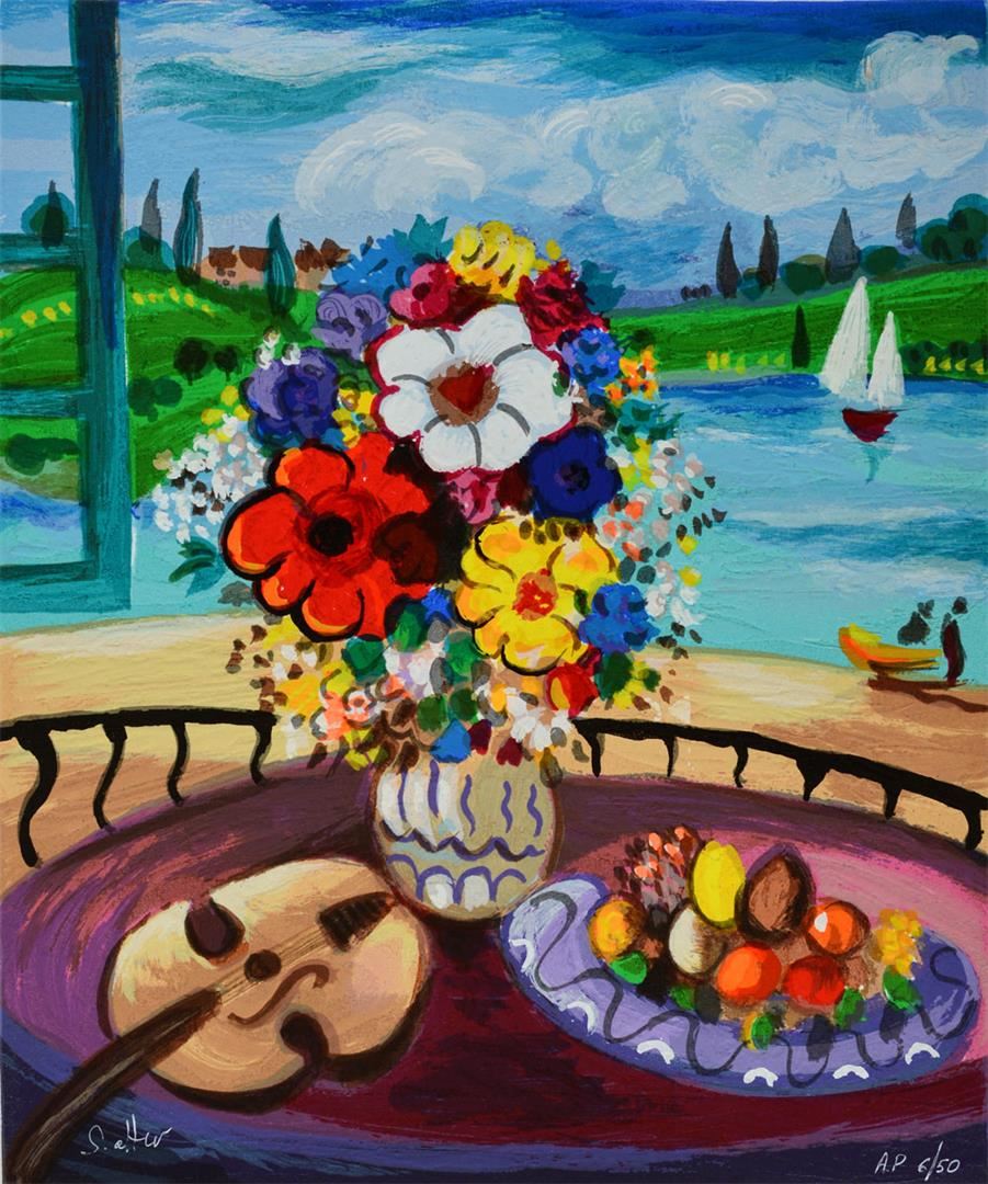 Artist: Shlomo Alter - Title: Flowers with Violin - Medium: Serigraph on Fine Art Paper - Signature: Hand-signed by the Artist - Limited Edition: AP 50 - Paper Size: Approximately 13.5 inches x 11.25 inches - Framed: Unframed - Details: This work comes with a Certificate of Authenticity - Biography: Shlomo Alter was born in Romania to a family of restaurateurs. He emigrated to Israel in 1948 and during high school he started to study painting under the well known artist Aaron Avni. Some of his early works appeared in UNICEF'S world touring exhibition of young artists. Altar's works are influenced by his early recollections of the well dressed people who gathered in the courtyard of his parent's restaurant in Bucharest to eat and drink, to dance of Gypsy bands, and to enjoy the convivial atmosphere. With a touch of optimism and good humor Alter's art reflects life at its core, an antithesis to the Nazi regime that shattered his childhood happiness. His paintings are like stage set on which the objects relate to each other through a glow of colors and lines - a frozen moment in time, a dynamic stillness prior to a burst of action. His style can best be compared to that of the Expressionists. He uses color to give direct expression to his ideas in influence by the famous, particularly Matisse and Duty.