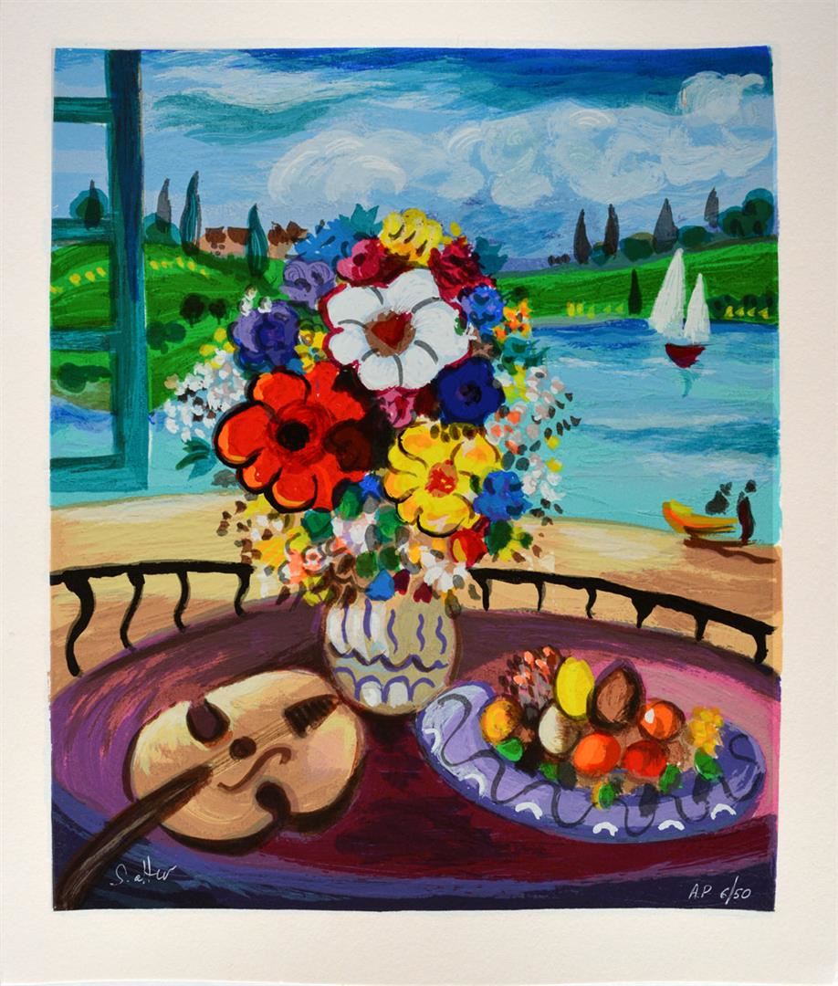 Artist: Shlomo Alter - Title: Flowers with Violin - Medium: Serigraph on Fine Art Paper - Signature: Hand-signed by the Artist - Limited Edition: AP 50 - Paper Size: Approximately 13.5 inches x 11.25 inches - Unframed - Details: This work comes with a Certificate of Authenticity - Biography: Shlomo Alter was born in Romania to a family of restaurateurs. He emigrated to Israel in 1948 and during high school he started to study painting under the well known artist Aaron Avni. Some of his early works appeared in UNICEF'S world touring exhibition of young artists. Altar's works are influenced by his early recollections of the well dressed people who gathered in the courtyard of his parent's restaurant in Bucharest to eat and drink, to dance of Gypsy bands, and to enjoy the convivial atmosphere. With a touch of optimism and good humor Alter's art reflects life at its core, an antithesis to the Nazi regime that shattered his childhood happiness. His paintings are like stage set on which the objects relate to each other through a glow of colors and lines - a frozen moment in time, a dynamic stillness prior to a burst of action. His style can best be compared to that of the Expressionists. He uses color to give direct expression to his ideas in influence by the famous, particularly Matisse and Duty.