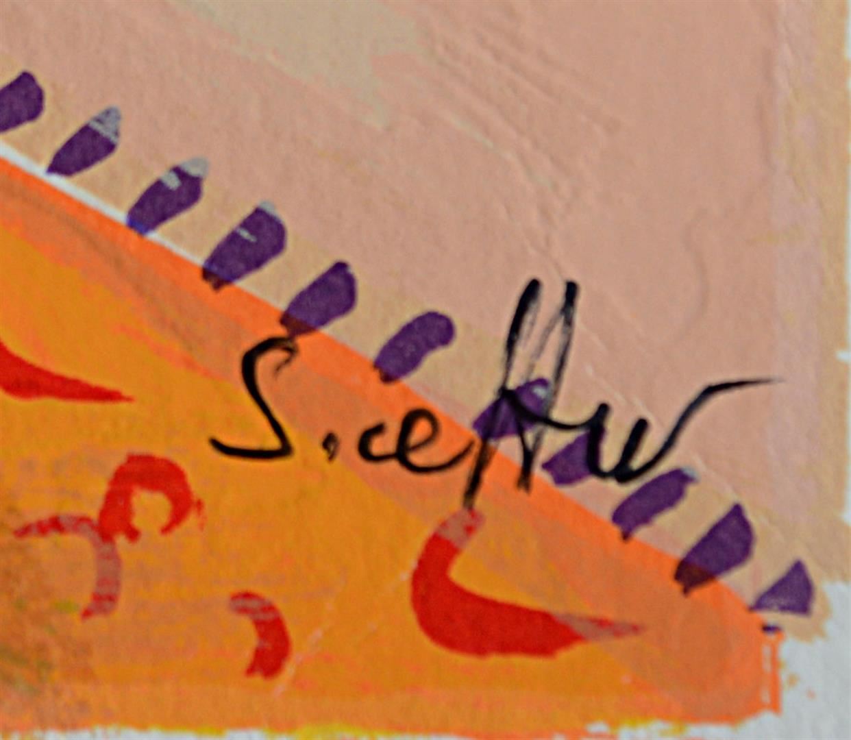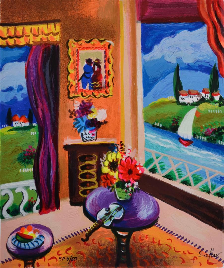 Artist: Shlomo Alter - Title: Interior - Medium: Serigraph on Fine Art Paper - Signature: Hand-signed by the Artist - Limited Edition: PP 50 - Paper Size: Approximately 11.5 inches x 9.5 inches - Framed: Unframed - Details: This work comes with a Certificate of Authenticity - Biography: Shlomo Alter was born in Romania to a family of restaurateurs. He emigrated to Israel in 1948 and during high school he started to study painting under the well known artist Aaron Avni. Some of his early works appeared in UNICEF'S world touring exhibition of young artists. Altar's works are influenced by his early recollections of the well dressed people who gathered in the courtyard of his parent's restaurant in Bucharest to eat and drink, to dance of Gypsy bands, and to enjoy the convivial atmosphere. With a touch of optimism and good humor Alter's art reflects life at its core, an antithesis to the Nazi regime that shattered his childhood happiness. His paintings are like stage set on which the objects relate to each other through a glow of colors and lines - a frozen moment in time, a dynamic stillness prior to a burst of action. His style can best be compared to that of the Expressionists. He uses color to give direct expression to his ideas in influence by the famous, particularly Matisse and Duty.