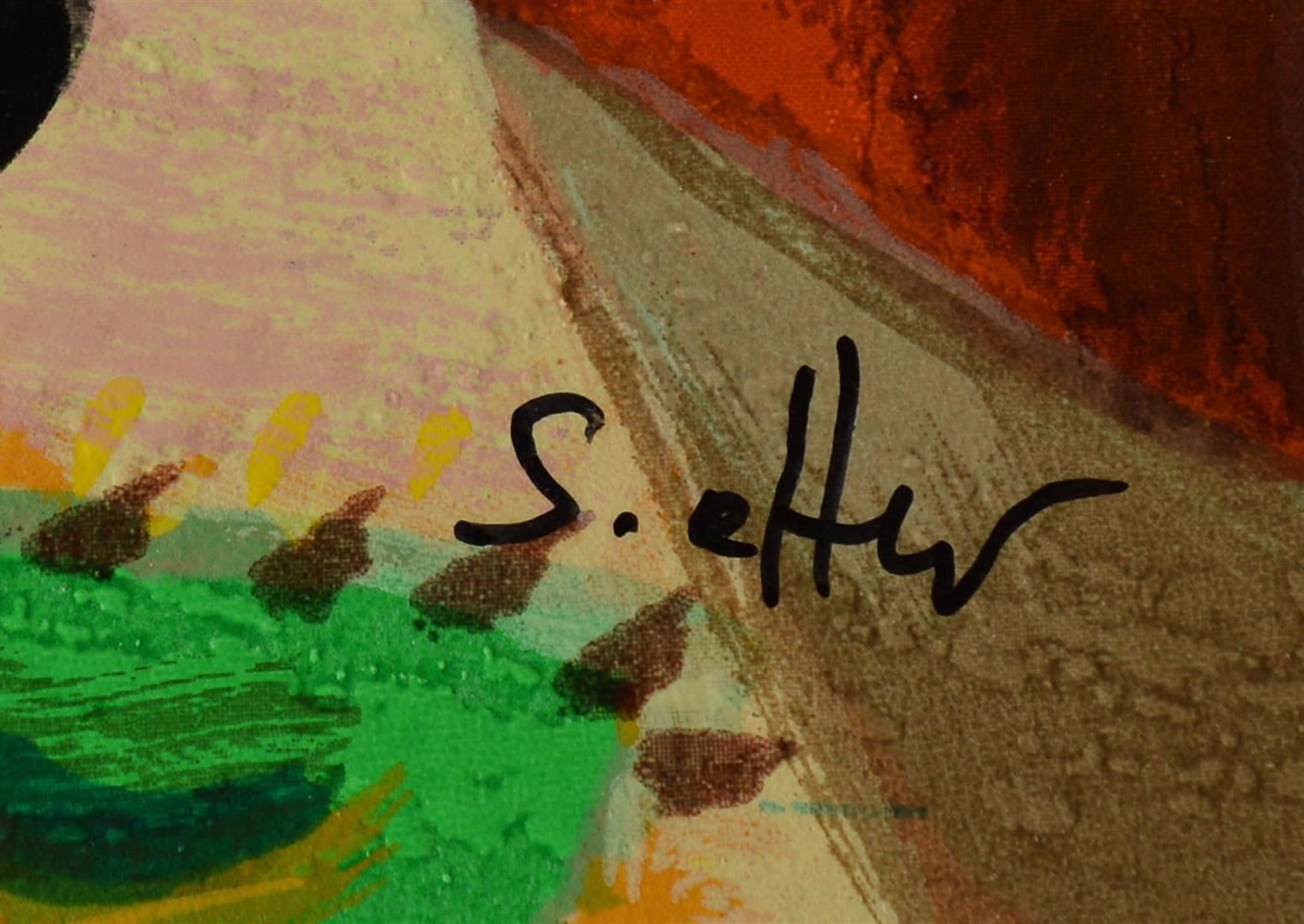 Artist: Shlomo Alter - Title: On the Balcony - Medium: Serigraph on Fine Art Paper - Signature: Hand-signed by the Artist - Limited Edition: AP 50 - Paper Size: Approximately 8.75 inches x 10.5 inches - Framed: Unframed - Details: This work comes with a Certificate of Authenticity - Biography: Shlomo Alter was born in Romania to a family of restaurateurs. He emigrated to Israel in 1948 and during high school he started to study painting under the well known artist Aaron Avni. Some of his early works appeared in UNICEF'S world touring exhibition of young artists. Altar's works are influenced by his early recollections of the well dressed people who gathered in the courtyard of his parent's restaurant in Bucharest to eat and drink, to dance of Gypsy bands, and to enjoy the convivial atmosphere. With a touch of optimism and good humor Alter's art reflects life at its core, an antithesis to the Nazi regime that shattered his childhood happiness. His paintings are like stage set on which the objects relate to each other through a glow of colors and lines - a frozen moment in time, a dynamic stillness prior to a burst of action. His style can best be compared to that of the Expressionists. He uses color to give direct expression to his ideas in influence by the famous, particularly Matisse and Duty.