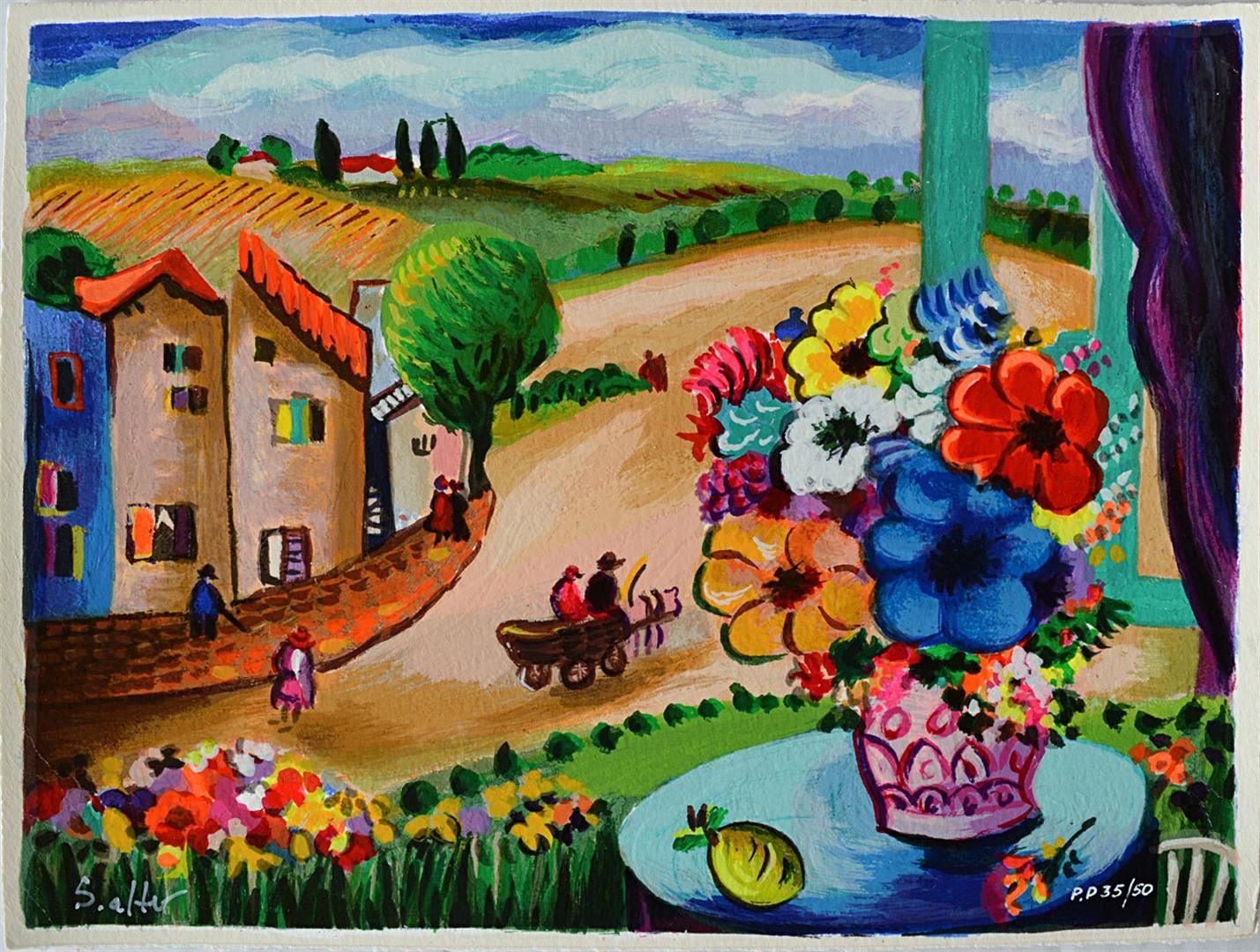 Artist: Shlomo Alter - Title: Pastoral Morning - Medium: Serigraph on Fine Art Paper - Signature: Hand-signed by the Artist - Limited Edition: PP 50 - Paper Size: Approximately 9.25 inches x 12.25 inches - Framed: Unframed - Details: This work comes with a Certificate of Authenticity - Biography: Shlomo Alter was born in Romania to a family of restaurateurs. He emigrated to Israel in 1948 and during high school he started to study painting under the well known artist Aaron Avni. Some of his early works appeared in UNICEF'S world touring exhibition of young artists. Altar's works are influenced by his early recollections of the well dressed people who gathered in the courtyard of his parent's restaurant in Bucharest to eat and drink, to dance of Gypsy bands, and to enjoy the convivial atmosphere. With a touch of optimism and good humor Alter's art reflects life at its core, an antithesis to the Nazi regime that shattered his childhood happiness. His paintings are like stage set on which the objects relate to each other through a glow of colors and lines - a frozen moment in time, a dynamic stillness prior to a burst of action. His style can best be compared to that of the Expressionists. He uses color to give direct expression to his ideas in influence by the famous, particularly Matisse and Duty.