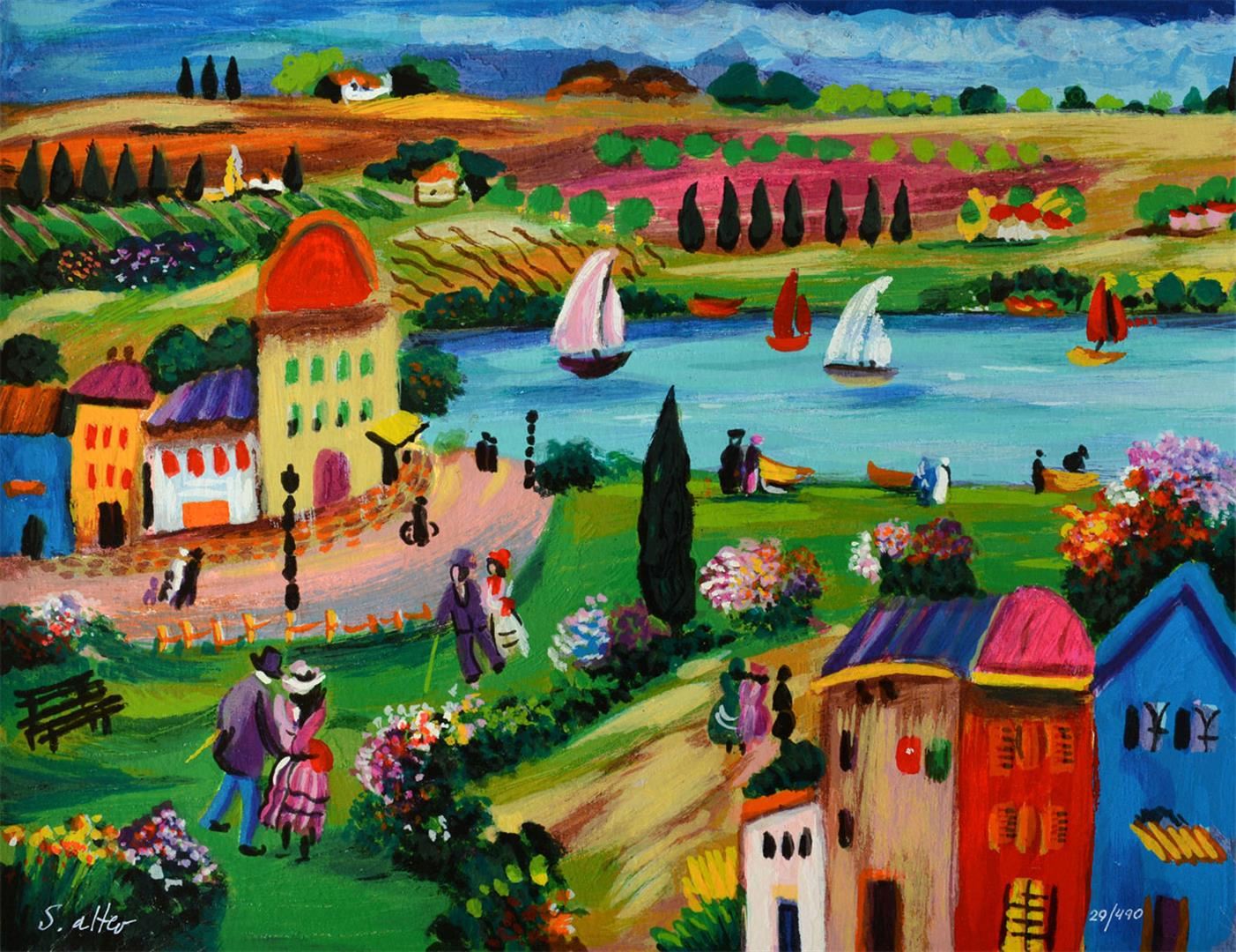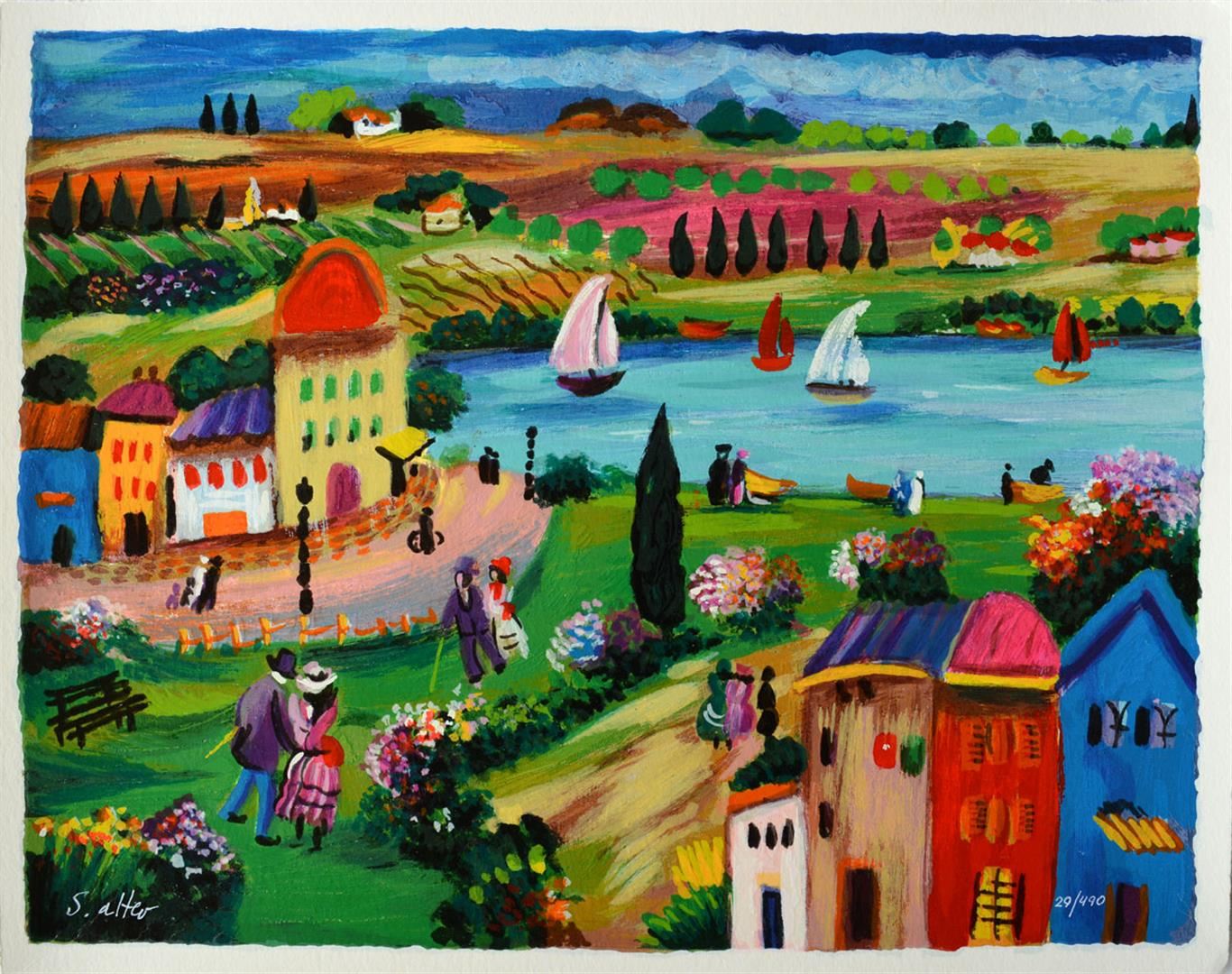 Artist: Shlomo Alter - Title: Sailboats - Medium: Serigraph on Fine Art Paper - Signature: Hand-signed by the Artist - Limited Edition: 490 - Paper Size: Approximately 13.5 inches x 16.75 inches - Framed: Unframed - Details: This work comes with a Certificate of Authenticity - Biography: Shlomo Alter was born in Romania to a family of restaurateurs. He emigrated to Israel in 1948 and during high school he started to study painting under the well known artist Aaron Avni. Some of his early works appeared in UNICEF'S world touring exhibition of young artists. Altar's works are influenced by his early recollections of the well dressed people who gathered in the courtyard of his parent's restaurant in Bucharest to eat and drink, to dance of Gypsy bands, and to enjoy the convivial atmosphere. With a touch of optimism and good humor Alter's art reflects life at its core, an antithesis to the Nazi regime that shattered his childhood happiness. His paintings are like stage set on which the objects relate to each other through a glow of colors and lines - a frozen moment in time, a dynamic stillness prior to a burst of action. His style can best be compared to that of the Expressionists. He uses color to give direct expression to his ideas in influence by the famous, particularly Matisse and Duty.