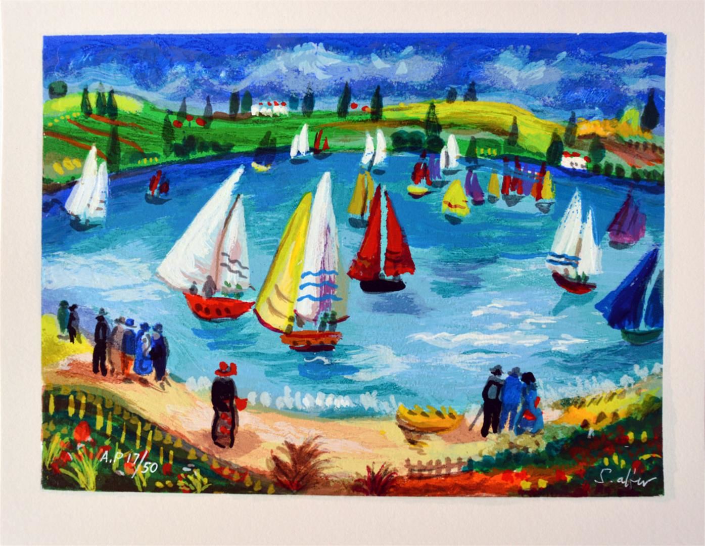 Artist: Shlomo Alter - Title: Sailing - Medium: Serigraph on Fine Art Paper - Signature: Hand-signed by the Artist - Limited Edition: AP 50 - Paper Size: Approximately 8.5 inches x 10.5 inches - Unframed - Details: This work comes with a Certificate of Authenticity - Biography: Shlomo Alter was born in Romania to a family of restaurateurs. He emigrated to Israel in 1948 and during high school he started to study painting under the well known artist Aaron Avni. Some of his early works appeared in UNICEF'S world touring exhibition of young artists. Altar's works are influenced by his early recollections of the well dressed people who gathered in the courtyard of his parent's restaurant in Bucharest to eat and drink, to dance of Gypsy bands, and to enjoy the convivial atmosphere. With a touch of optimism and good humor Alter's art reflects life at its core, an antithesis to the Nazi regime that shattered his childhood happiness. His paintings are like stage set on which the objects relate to each other through a glow of colors and lines - a frozen moment in time, a dynamic stillness prior to a burst of action. His style can best be compared to that of the Expressionists. He uses color to give direct expression to his ideas in influence by the famous, particularly Matisse and Duty.
