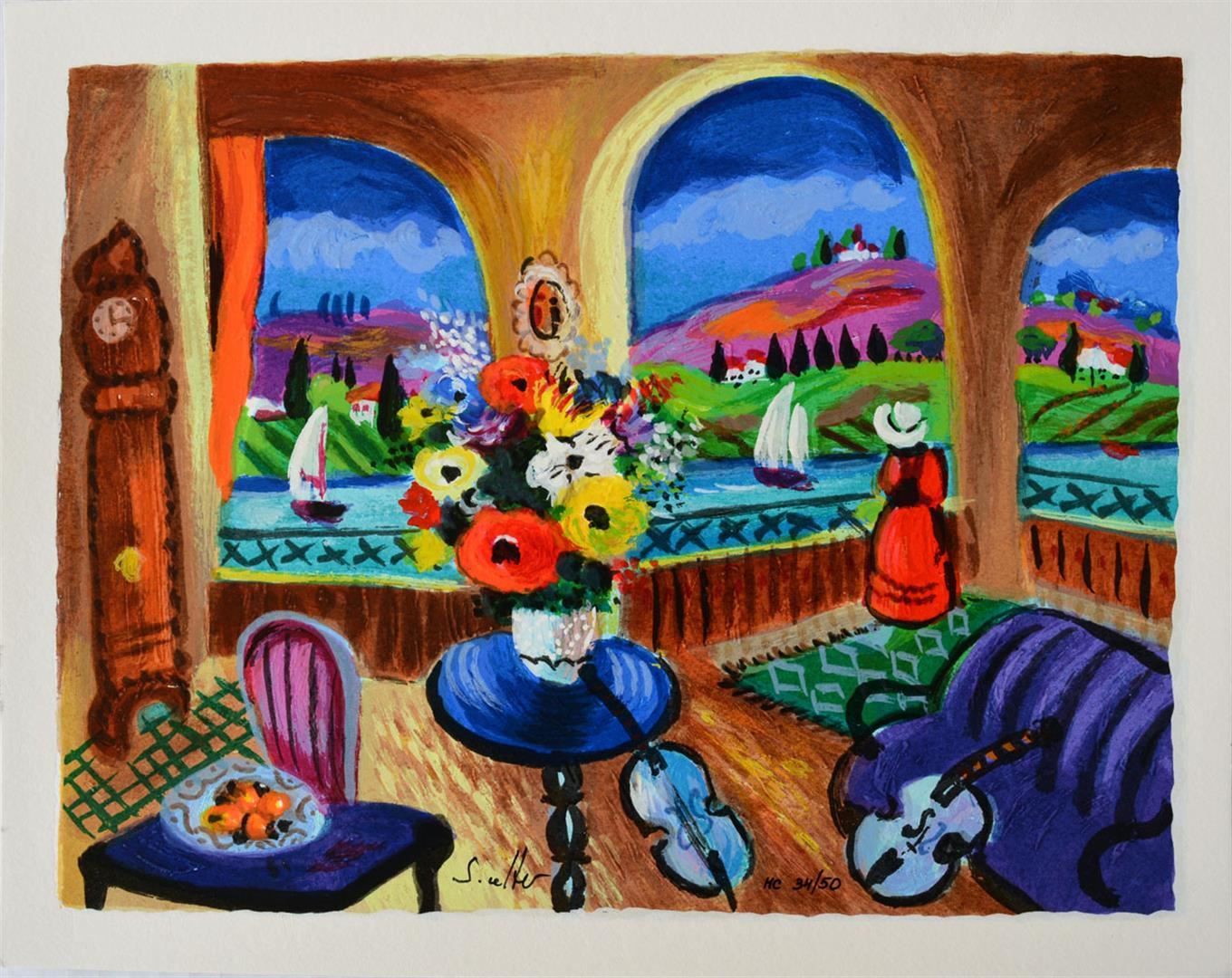 Artist: Shlomo Alter - Title: Spanish Guitar - Medium: Serigraph on Fine Art Paper - Signature: Hand-signed by the Artist - Limited Edition: HC50 - Paper Size: Approximately 9.75 inches x 12.5 inches - Framed: Unframed - Details: This work comes with a Certificate of Authenticity - Biography: Shlomo Alter was born in Romania to a family of restaurateurs. He emigrated to Israel in 1948 and during high school he started to study painting under the well known artist Aaron Avni. Some of his early works appeared in UNICEF'S world touring exhibition of young artists. Altar's works are influenced by his early recollections of the well dressed people who gathered in the courtyard of his parent's restaurant in Bucharest to eat and drink, to dance of Gypsy bands, and to enjoy the convivial atmosphere. With a touch of optimism and good humor Alter's art reflects life at its core, an antithesis to the Nazi regime that shattered his childhood happiness. His paintings are like stage set on which the objects relate to each other through a glow of colors and lines - a frozen moment in time, a dynamic stillness prior to a burst of action. His style can best be compared to that of the Expressionists. He uses color to give direct expression to his ideas in influence by the famous, particularly Matisse and Duty.