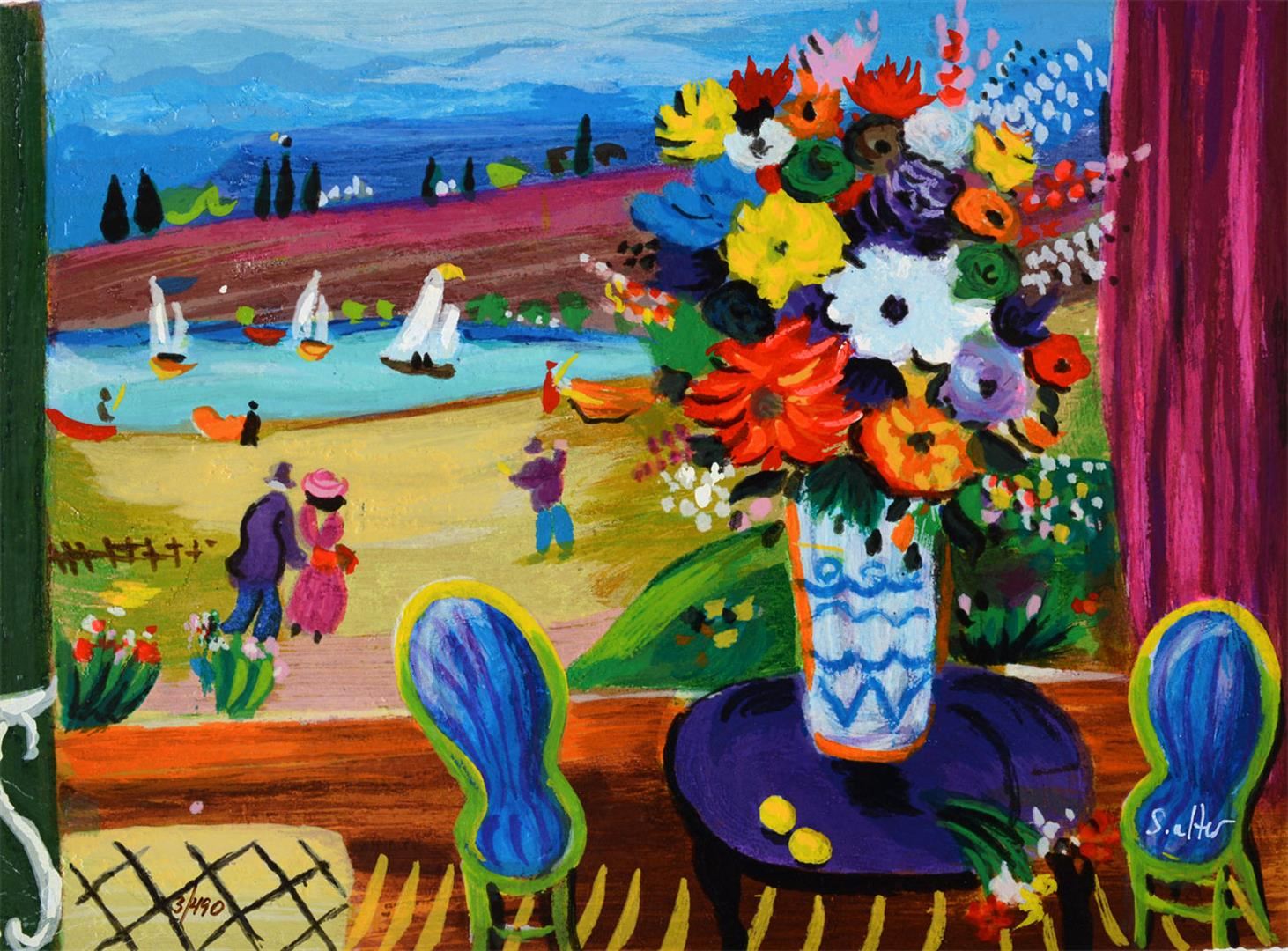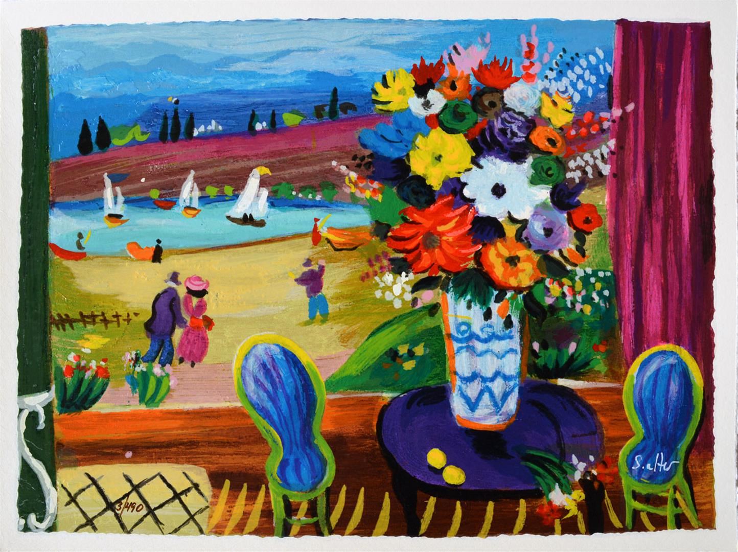 Artist: Shlomo Alter - Title: Stormy Skies - Medium: Serigraph on Fine Art Paper - Signature: Hand-signed by the Artist - Limited Edition: 490 - Paper Size: Approximately 10 inches x 13.25 inches - Framed: Unframed - Details: This work comes with a Certificate of Authenticity - Biography: Shlomo Alter was born in Romania to a family of restaurateurs. He emigrated to Israel in 1948 and during high school he started to study painting under the well known artist Aaron Avni. Some of his early works appeared in UNICEF'S world touring exhibition of young artists. Altar's works are influenced by his early recollections of the well dressed people who gathered in the courtyard of his parent's restaurant in Bucharest to eat and drink, to dance of Gypsy bands, and to enjoy the convivial atmosphere. With a touch of optimism and good humor Alter's art reflects life at its core, an antithesis to the Nazi regime that shattered his childhood happiness. His paintings are like stage set on which the objects relate to each other through a glow of colors and lines - a frozen moment in time, a dynamic stillness prior to a burst of action. His style can best be compared to that of the Expressionists. He uses color to give direct expression to his ideas in influence by the famous, particularly Matisse and Duty.