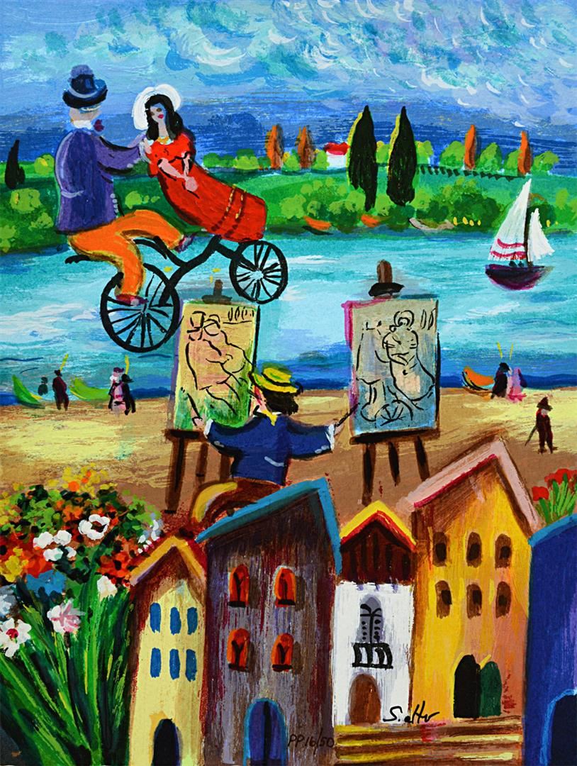Artist: Shlomo Alter - Title: The Lovers - Medium: Serigraph on Fine Art Paper - Signature: Hand-signed by the Artist - Limited Edition: PP 50 - Paper Size: Approximately 12.75 inches x 9.75 inches - Unframed - Details: This work comes with a Certificate of Authenticity - Biography: Shlomo Alter was born in Romania to a family of restaurateurs. He emigrated to Israel in 1948 and during high school he started to study painting under the well known artist Aaron Avni. Some of his early works appeared in UNICEF'S world touring exhibition of young artists. Altar's works are influenced by his early recollections of the well dressed people who gathered in the courtyard of his parent's restaurant in Bucharest to eat and drink, to dance of Gypsy bands, and to enjoy the convivial atmosphere. With a touch of optimism and good humor Alter's art reflects life at its core, an antithesis to the Nazi regime that shattered his childhood happiness. His paintings are like stage set on which the objects relate to each other through a glow of colors and lines - a frozen moment in time, a dynamic stillness prior to a burst of action. His style can best be compared to that of the Expressionists. He uses color to give direct expression to his ideas in influence by the famous, particularly Matisse and Duty.