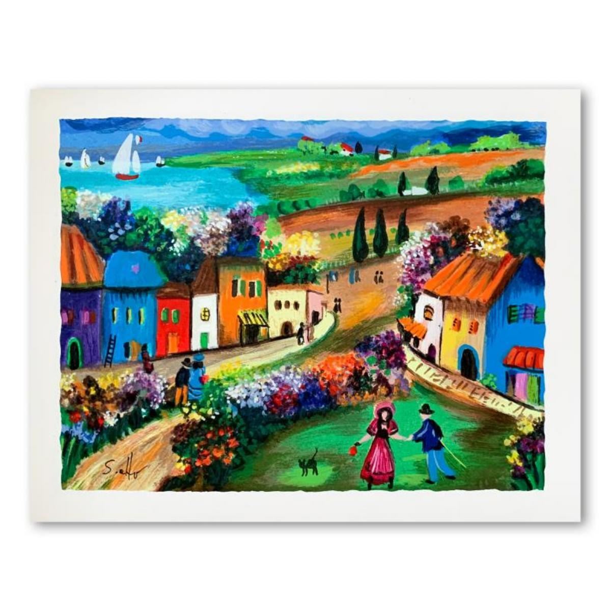 "The Village" is a limited edition serigraph on paper by Shlomo Alter. It is numbered and hand signed and includes a letter of authenticity. Measures approximately 8.5" x 11" (image).