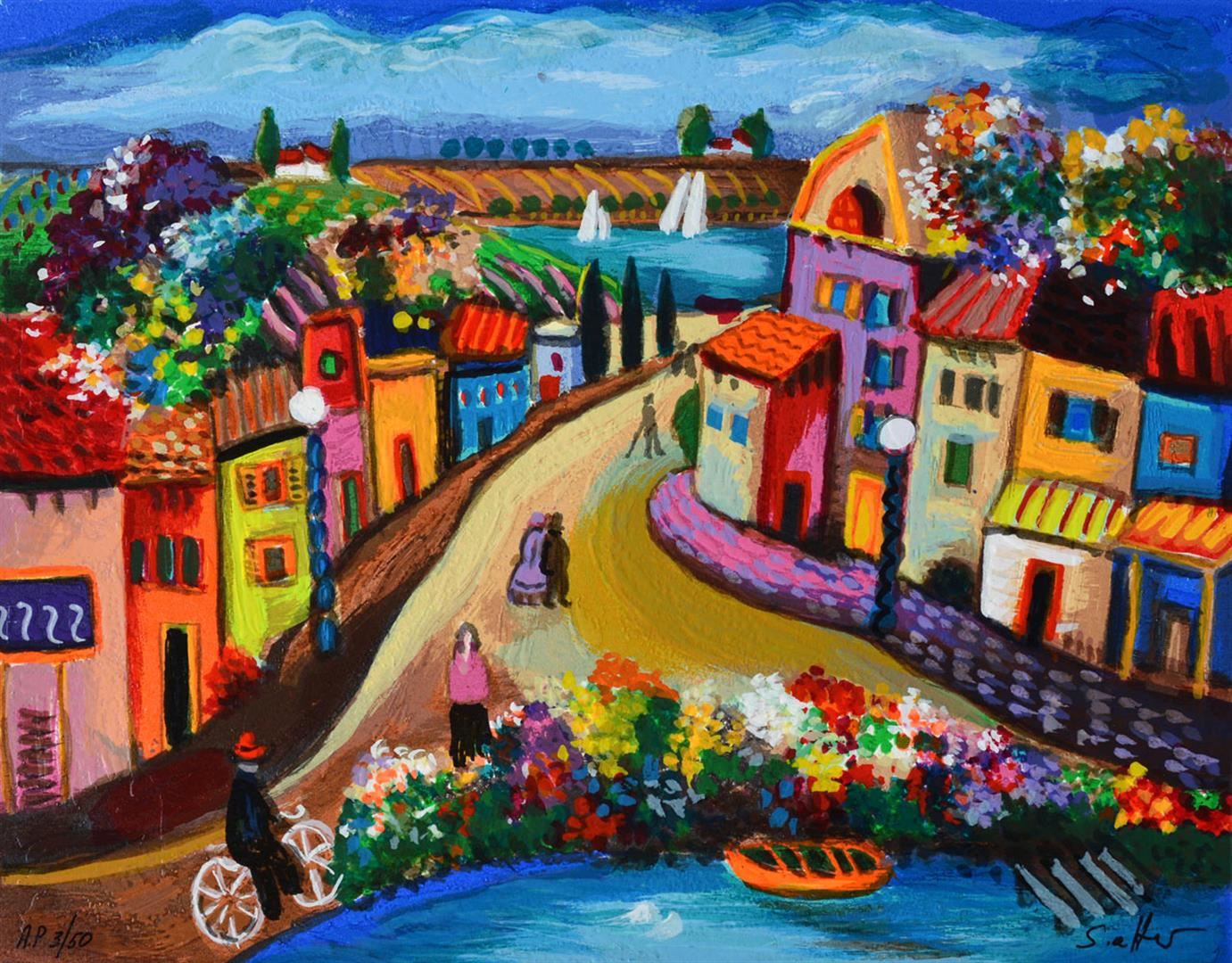 Artist: Shlomo Alter - Title: Town on a Lake - Medium: Serigraph on Fine Art Paper - Signature: Hand-signed by the Artist - Limited Edition: AP 50 - Paper Size: Approximately 11.25 inches x 13.75 inches - Framed: Unframed - Details: This work comes with a Certificate of Authenticity - Biography: Shlomo Alter was born in Romania to a family of restaurateurs. He emigrated to Israel in 1948 and during high school he started to study painting under the well known artist Aaron Avni. Some of his early works appeared in UNICEF'S world touring exhibition of young artists. Altar's works are influenced by his early recollections of the well dressed people who gathered in the courtyard of his parent's restaurant in Bucharest to eat and drink, to dance of Gypsy bands, and to enjoy the convivial atmosphere. With a touch of optimism and good humor Alter's art reflects life at its core, an antithesis to the Nazi regime that shattered his childhood happiness. His paintings are like stage set on which the objects relate to each other through a glow of colors and lines - a frozen moment in time, a dynamic stillness prior to a burst of action. His style can best be compared to that of the Expressionists. He uses color to give direct expression to his ideas in influence by the famous, particularly Matisse and Duty.
