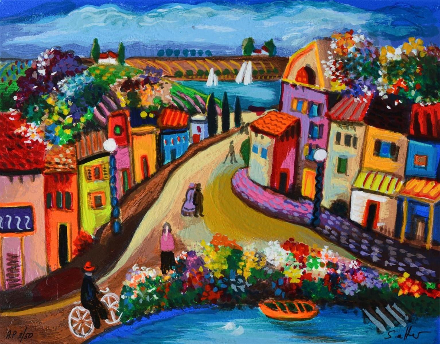 Artist: Shlomo Alter - Title: Town on a Lake - Medium: Serigraph on Fine Art Paper - Signature: Hand-signed by the Artist - Limited Edition: AP 50 - Paper Size: Approximately 11.25 inches x 13.75 inches - Framed: Unframed - Details: This work comes with a Certificate of Authenticity - Biography: Shlomo Alter was born in Romania to a family of restaurateurs. He emigrated to Israel in 1948 and during high school he started to study painting under the well known artist Aaron Avni. Some of his early works appeared in UNICEF'S world touring exhibition of young artists. Altar's works are influenced by his early recollections of the well dressed people who gathered in the courtyard of his parent's restaurant in Bucharest to eat and drink, to dance of Gypsy bands, and to enjoy the convivial atmosphere. With a touch of optimism and good humor Alter's art reflects life at its core, an antithesis to the Nazi regime that shattered his childhood happiness. His paintings are like stage set on which the objects relate to each other through a glow of colors and lines - a frozen moment in time, a dynamic stillness prior to a burst of action. His style can best be compared to that of the Expressionists. He uses color to give direct expression to his ideas in influence by the famous, particularly Matisse and Duty.