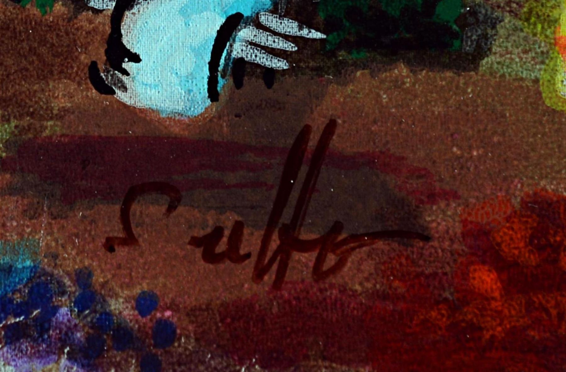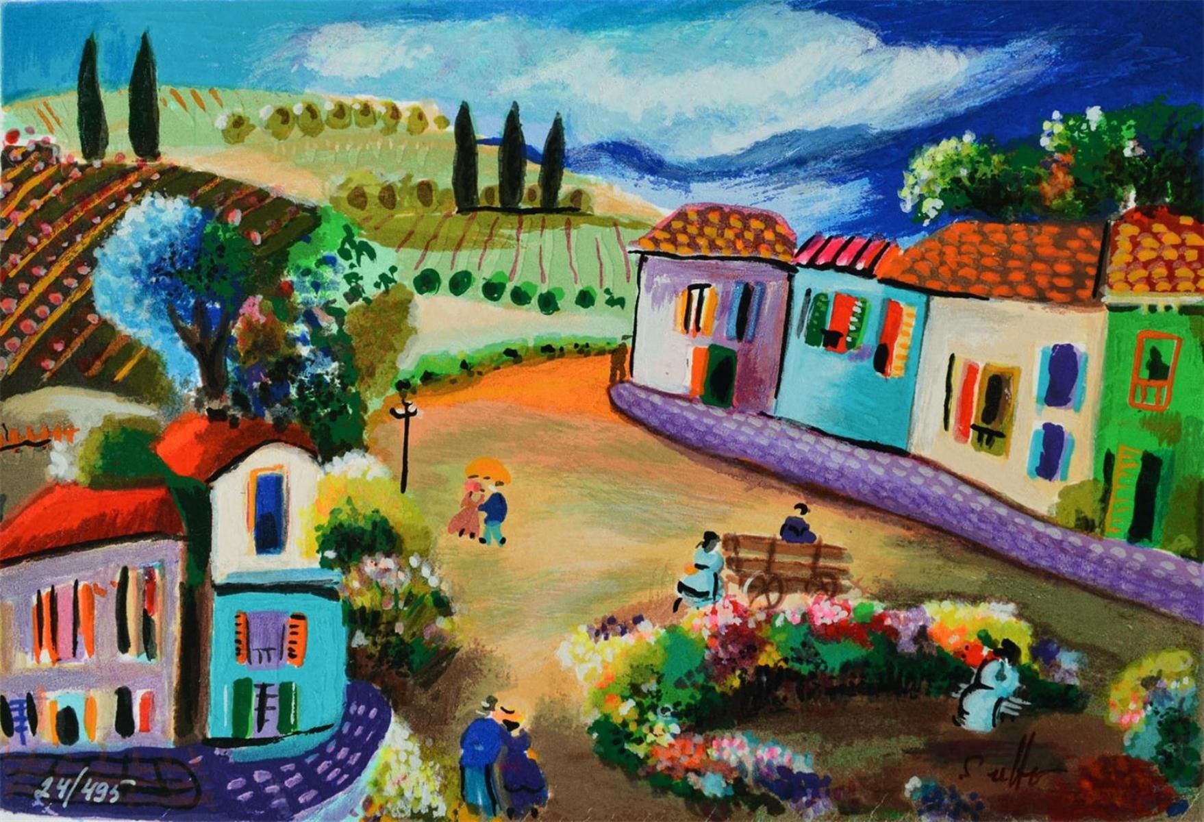 Artist: Shlomo Alter - Title: Untitled - Medium: Serigraph on Fine Art Paper - Signature: Hand-signed by the Artist - Limited Edition: 495 - Paper Size: Approximately 8.25 inches x 12.25 inches - Unframed - Details: This work comes with a Certificate of Authenticity - Biography: Shlomo Alter was born in Romania to a family of restaurateurs. He emigrated to Israel in 1948 and during high school he started to study painting under the well known artist Aaron Avni. Some of his early works appeared in UNICEF'S world touring exhibition of young artists. Altar's works are influenced by his early recollections of the well dressed people who gathered in the courtyard of his parent's restaurant in Bucharest to eat and drink, to dance of Gypsy bands, and to enjoy the convivial atmosphere. With a touch of optimism and good humor Alter's art reflects life at its core, an antithesis to the Nazi regime that shattered his childhood happiness. His paintings are like stage set on which the objects relate to each other through a glow of colors and lines - a frozen moment in time, a dynamic stillness prior to a burst of action. His style can best be compared to that of the Expressionists. He uses color to give direct expression to his ideas in influence by the famous, particularly Matisse and Duty.