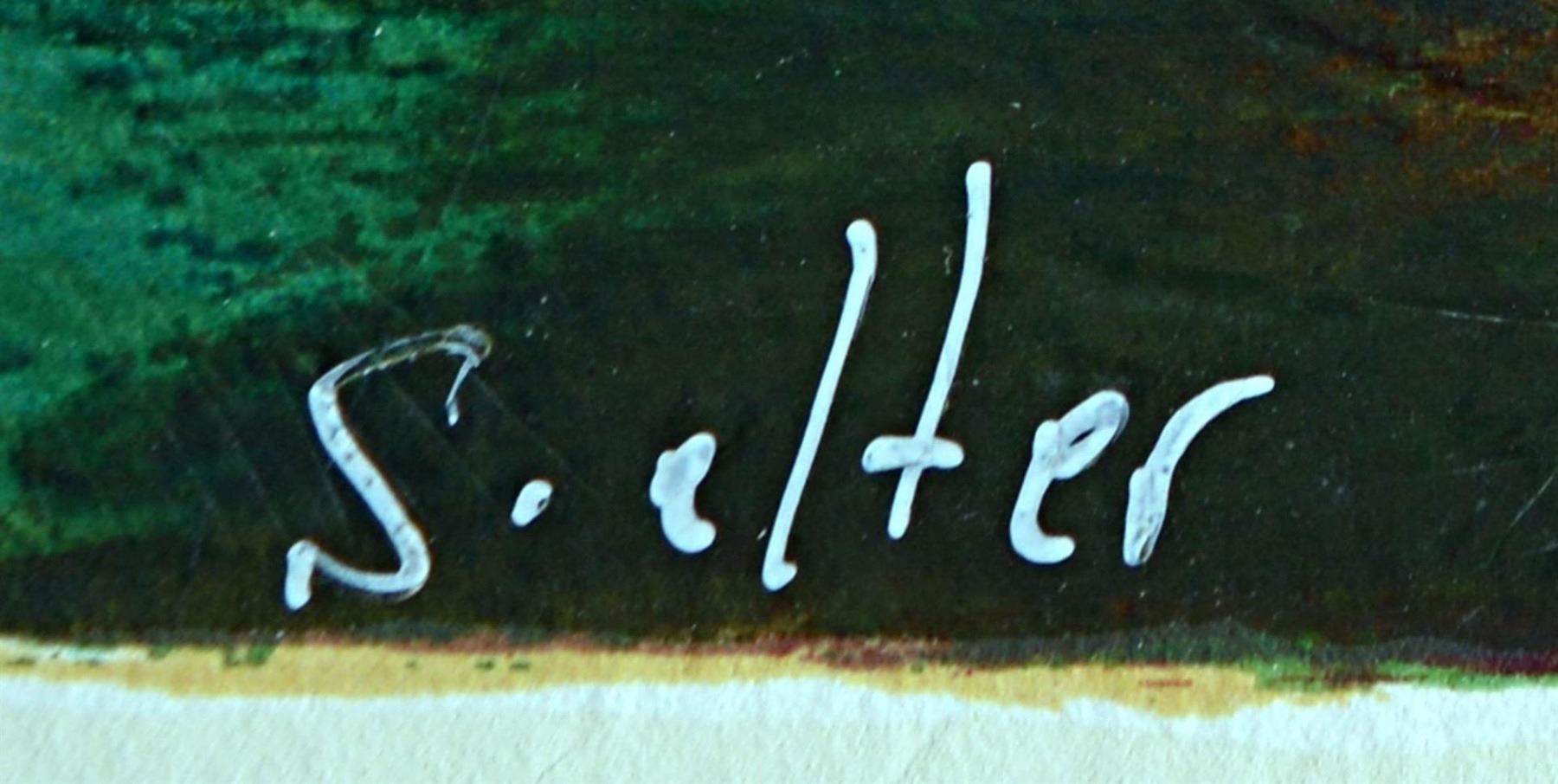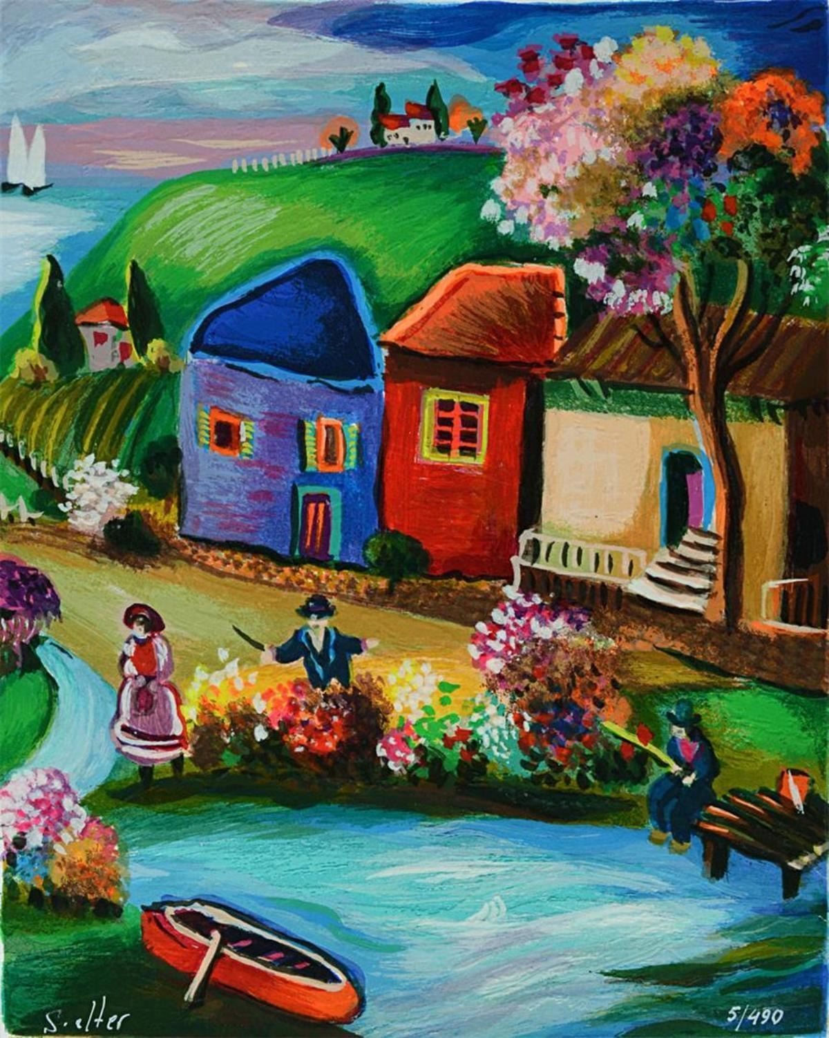 Artist: Shlomo Alter - Title: Vacation - Medium: Serigraph on Fine Art Paper - Signature: Hand-signed by the Artist - Limited Edition: 490 - Paper Size: Approximately 11.5 inches x 9 inches - Unframed - Details: This work comes with a Certificate of Authenticity - Biography: Shlomo Alter was born in Romania to a family of restaurateurs. He emigrated to Israel in 1948 and during high school he started to study painting under the well known artist Aaron Avni. Some of his early works appeared in UNICEF'S world touring exhibition of young artists. Altar's works are influenced by his early recollections of the well dressed people who gathered in the courtyard of his parent's restaurant in Bucharest to eat and drink, to dance of Gypsy bands, and to enjoy the convivial atmosphere. With a touch of optimism and good humor Alter's art reflects life at its core, an antithesis to the Nazi regime that shattered his childhood happiness. His paintings are like stage set on which the objects relate to each other through a glow of colors and lines - a frozen moment in time, a dynamic stillness prior to a burst of action. His style can best be compared to that of the Expressionists. He uses color to give direct expression to his ideas in influence by the famous, particularly Matisse and Duty.