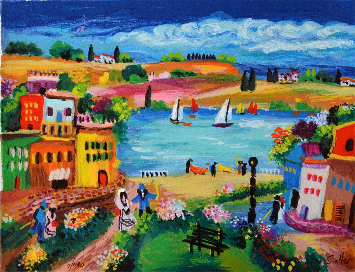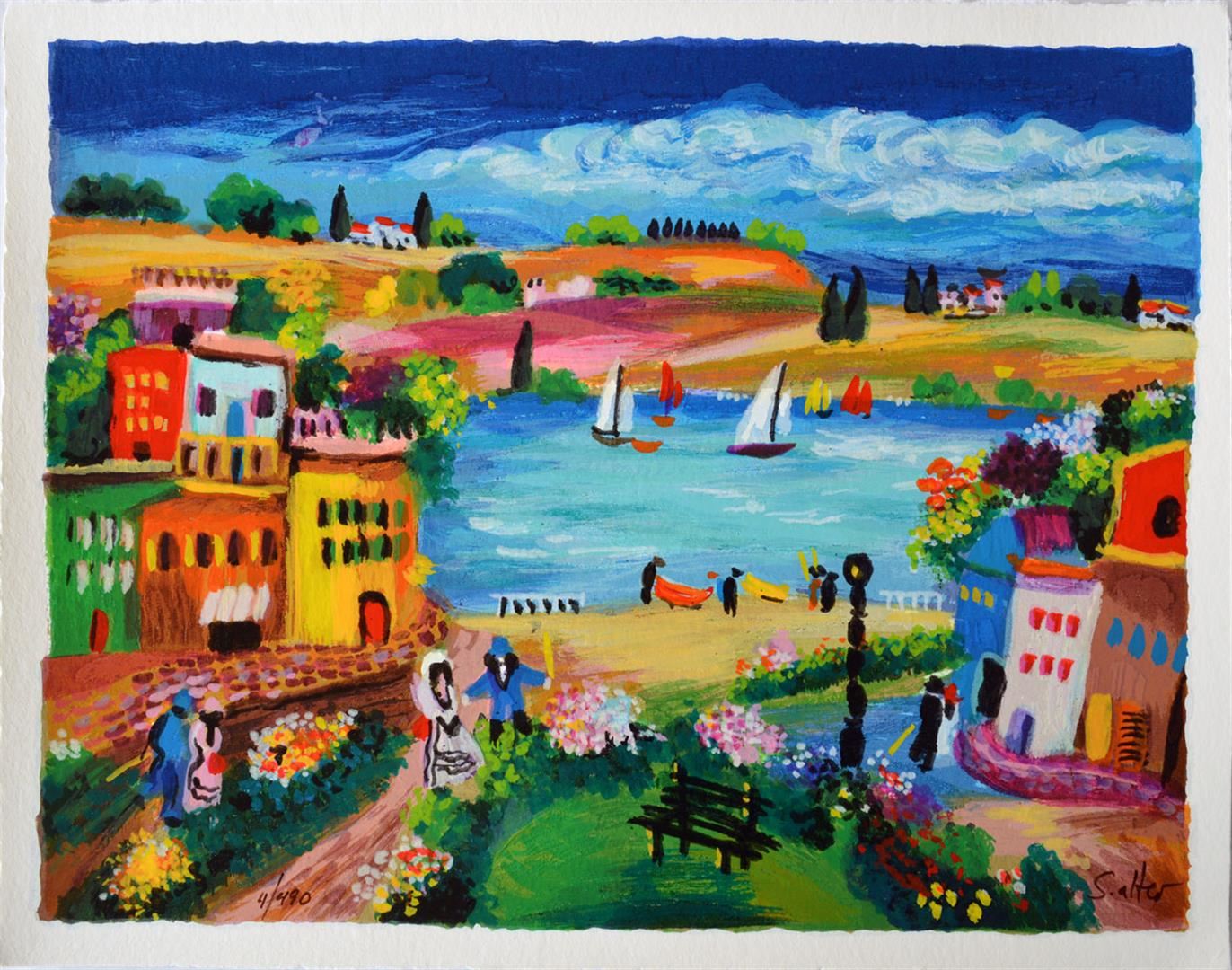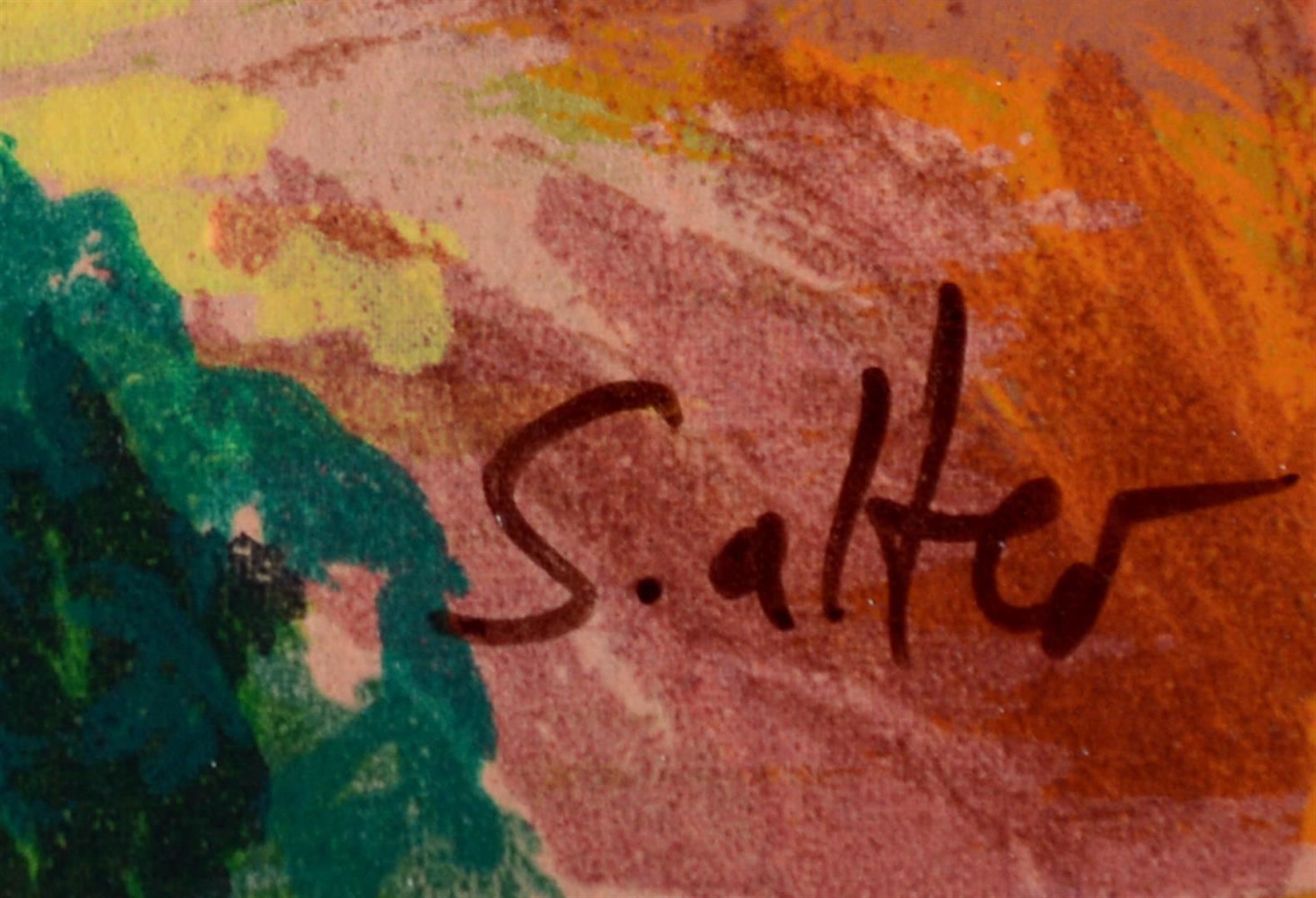 Artist: Shlomo Alter - Title: View from a Window - Medium: Serigraph on Fine Art Paper - Signature: Hand-signed by the Artist - Limited Edition: 490 - Paper Size: Approximately 9.75 inches x 12.5 inches - Unframed - Details: This work comes with a Certificate of Authenticity - Biography: Shlomo Alter was born in Romania to a family of restaurateurs. He emigrated to Israel in 1948 and during high school he started to study painting under the well known artist Aaron Avni. Some of his early works appeared in UNICEF'S world touring exhibition of young artists. Altar's works are influenced by his early recollections of the well dressed people who gathered in the courtyard of his parent's restaurant in Bucharest to eat and drink, to dance of Gypsy bands, and to enjoy the convivial atmosphere. With a touch of optimism and good humor Alter's art reflects life at its core, an antithesis to the Nazi regime that shattered his childhood happiness. His paintings are like stage set on which the objects relate to each other through a glow of colors and lines - a frozen moment in time, a dynamic stillness prior to a burst of action. His style can best be compared to that of the Expressionists. He uses color to give direct expression to his ideas in influence by the famous, particularly Matisse and Duty.