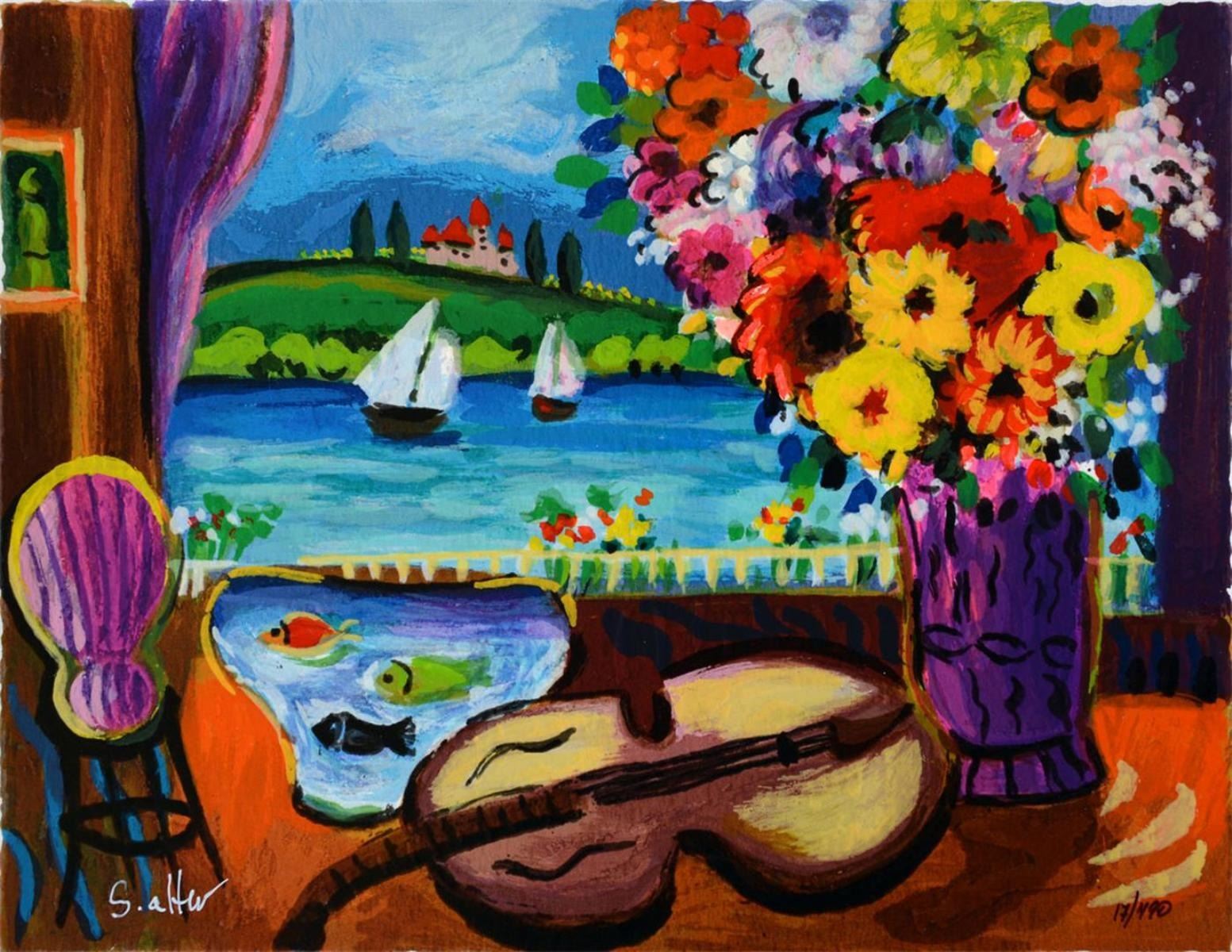 Artist: Shlomo Alter - Title: Violinists view - Medium: Serigraph on Fine Art Paper - Signature: Hand-signed by the Artist - Limited Edition: 490 - Paper Size: Approximately 9.75 inches x 12.5 inches - Framed: Unframed - Details: This work comes with a Certificate of Authenticity - Biography: Shlomo Alter was born in Romania to a family of restaurateurs. He emigrated to Israel in 1948 and during high school he started to study painting under the well known artist Aaron Avni. Some of his early works appeared in UNICEF'S world touring exhibition of young artists. Altar's works are influenced by his early recollections of the well dressed people who gathered in the courtyard of his parent's restaurant in Bucharest to eat and drink, to dance of Gypsy bands, and to enjoy the convivial atmosphere. With a touch of optimism and good humor Alter's art reflects life at its core, an antithesis to the Nazi regime that shattered his childhood happiness. His paintings are like stage set on which the objects relate to each other through a glow of colors and lines - a frozen moment in time, a dynamic stillness prior to a burst of action. His style can best be compared to that of the Expressionists. He uses color to give direct expression to his ideas in influence by the famous, particularly Matisse and Duty.