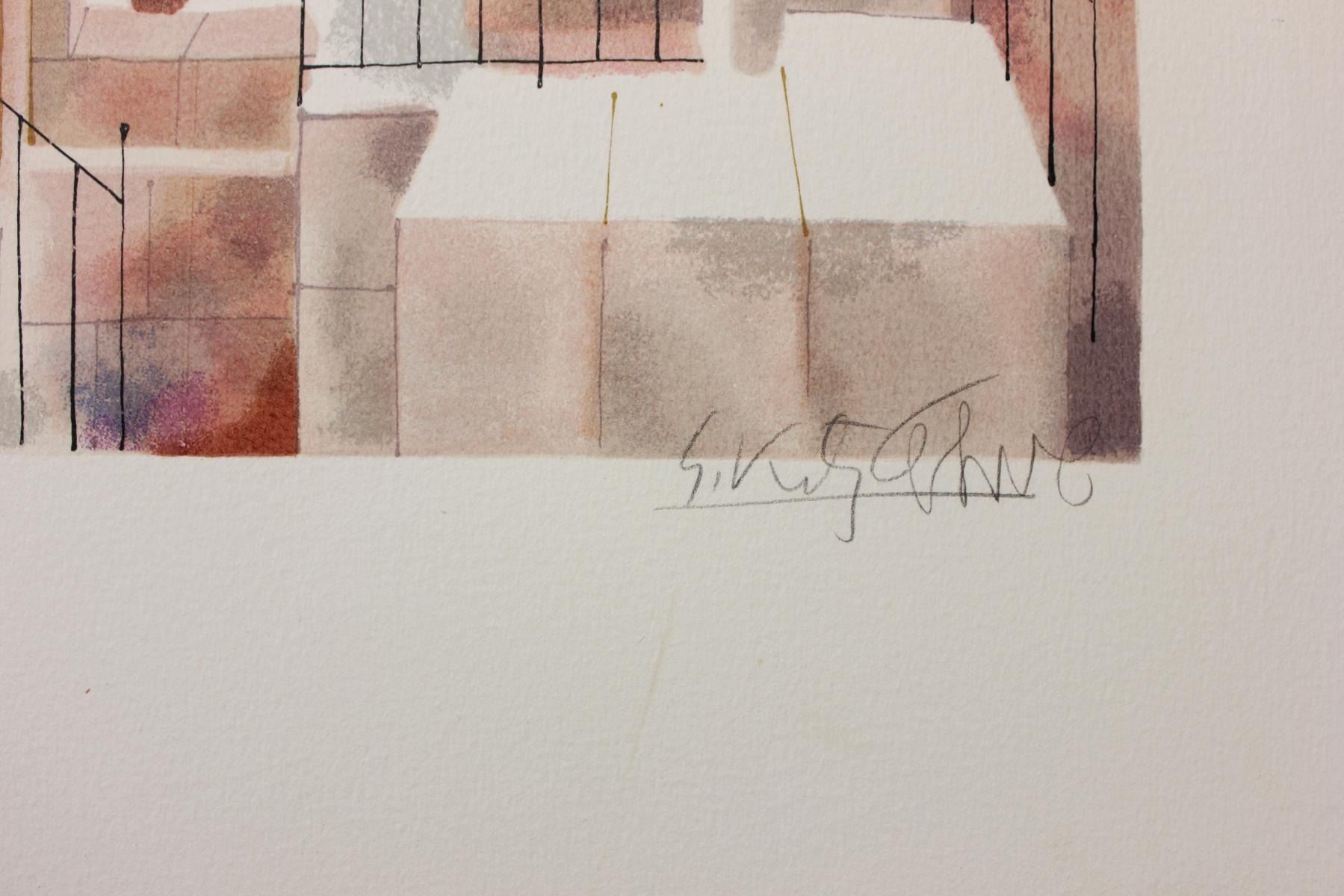 Artist: Shmuel Katz. Medium: Serigraph on Paper. Title: Jerusalem - Triptych . Size (Unframed): 31.5" x 47". Limited Edition: 400. Certificate of Authenticity: From Gol Art Gallery and Publishing. Additional: Katz has developed a mature personal style, rich in theme and technical device. He is, first and foremost, a draughtsman. Yet, his drawings do not merely delineate the contours of the figure, object or landscape; they are charged with a latent vitality that gives throbbing life to his subject matter and hint at what lies behind the visible objects. His arabesques seem to embrace his subject with a tenderness that is at times lyrical, and at times mischievous. Dark patches afford a pronounced sense of volume, of perspective and of figural modeling. Yet, it is the element of movement in the drawings of Katz, that brings to the fore his propensity for observing reality through the eyes of a poet and expressing it in his distinctive personal style. Shmuel Katz was born in Vienna in 1926. He spent World War II in hiding in Hungary, after escaping from a concentration camp. With the conclusion of the War, he attempted to enter Palestine with a group of illegal immigrants. Intercepted by the British, the group was deported to a displaced persons' camp in Cyprus. It was there that Katz's artistic talents were discovered. With nothing else to occupy his time, he began drawing, and his work was exhibited in Cyprus. However, upon arriving in Israel in 1947 Katz set aside his newfound interest in order to help found Kibbutz Gaaton in 1948, and to fight in the War of Independence. It was only in the early fifties that Katz returned to artwork, when he was approached and asked to illustrate a children's magazine, and his kibbutz, more understanding than many to creative needs, sent him to study in Paris. Returning to Israel and his kibbutz, he has since devoted his life to drawing and painting - never neglecting his duties to the kibbutz, sharing the guard shifts and kitchen duty that falls to all members.. Jerusalem - Triptych . Reference# 10329.