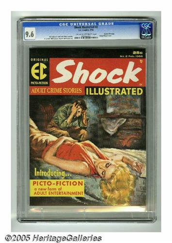 <B>Shock Illustrated #2 Gaines File Copy pedigree (EC, 1956) CGC NM+ 9.6 Cream to off-white pages.</B></I> Rudy Nappi's evocative painted cover draws the reader into tales illustrated by Al Williamson (redrawn from <B>Crime SuspenStories</B></I> #13), Graham Ingels, Reed Crandall, and George Evans. Overstreet 2005 NM- 9.2 value = $190. CGC census 7/05: 4 in 9.6, none higher.