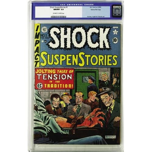 <B>Shock SuspenStories #1 Gaines File pedigree 8/11 (EC, 1952) CGC NM/MT 9.8 Off-white to white pages.</B></I> Al Feldstein's electrocution cover was perfect for the first issue of the title, and it rates a "classic" designation from Overstreet. With interior art by Jack Kamen, Graham Ingels, Joe Orlando, and Jack Davis, this was an instant nominee for comicdom's Hall of Fame. In less than three years, this title racked up an impressive number of "warning" citings by watchdog publications, dealt with some of the more controversial socio-political topics of the day, and generally offered stories and art that are universally recognized as milestones today. With all due respect to Bob Overstreet who ranked the Gaines books, we find it hard to believe that seven nicer copies of this issue exist, and CGC's census bears that out thus far. Overstreet 2006 NM- 9.2 value = $1,225. CGC census 03/06: 2 in 9.8, 1 higher.