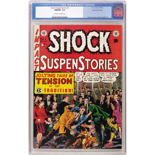 <B>Shock SuspenStories #2 Gaines File pedigree 7/10 (EC, 1952) CGC NM/MT 9.8 Off-white to white pages.</B></I> One of Wally Wood's most memorable covers is well spent on the second issue of this title which ran for nearly four years. The naked eye detects nary a flaw on this superlative copy, but CGC's microscope must have found something to keep the official grade at a mere 9.8. Close enough to perfect for us. Overstreet 2006 NM- 9.2 value = $685. CGC census 10/06: 2 in 9.8, none higher.<BR><BR><b>Shipping:</b> Slabbed Comic (<a target="_blank" href="http://www.heritageauctions.com/common/shipping.php">view shipping information</a>)