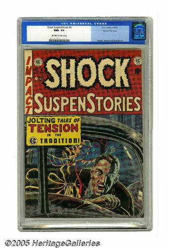 <B>Shock SuspenStories #4 Gaines File pedigree (EC, 1952) CGC NM+ 9.6 Off-white to white pages.</B></I> Wally Wood's dynamic cover comes alive on this beautiful copy from the Gaines vault. No copy has earned a higher grade from CGC to date. This issue was cited in <B>Seduction of the Innocent</B></I>. Wood, Jack Kamen, and Joe Orlando handled the interior art. While CGC has certified this as a Gaines File copy, no certificate accompanies this lot. Overstreet 2005 NM- 9.2 value = $460. CGC census 7/05: 2 in 9.6, none higher.