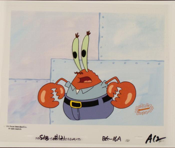 This animation cel and reproduction background are from the Nickelodeon TV show SpongeBob Squarepants. The story takes place under the deep blue sea in Bikini Bottom, where SpongeBob resides. SpongeBob, who is a yellow, porous sponge, is your typical happy-go-lucky character, as he is always cheerful and enjoys making people laugh. Patrick Star, SpongeBob's neighbor who is a starfish, is your average children's show idiot, as he boasts knowing nothing and is often getting himself into ridiculous situations. Between the homes of these two lies the home of the miserable Squidward, a squid, who is known for being grouchy and playing tricks on SpongeBob and Patrick. Both SpongeBob and Squidward work at the Krusty Krab, a fast food business run by the greedy money-loving Mr. Krabs, a crab, the arch rival of the evil, possibly misunderstood, Plankton. Another neighbor, Sandy Cheeks, an athletic squirrel who normally wears an astronaut's space suit, was introduced in "Tea at the Treedome." She spends most of her time inventing and experimenting. Mr. Krabs looks shocked. Original Printed Background and Animated Cel Overall Size of Background: 11" x 17" Overall Size of the Cel: 10 1/2" x 12 1/2" Very good condition This is an original hand-painted cel set-up used in the production of an episode of "SpongeBob SquarePants." Each one-of-a-kind set-up represents a slight change in position of the characters. When individually photographed and projected in rapid succession, the images appear to move.