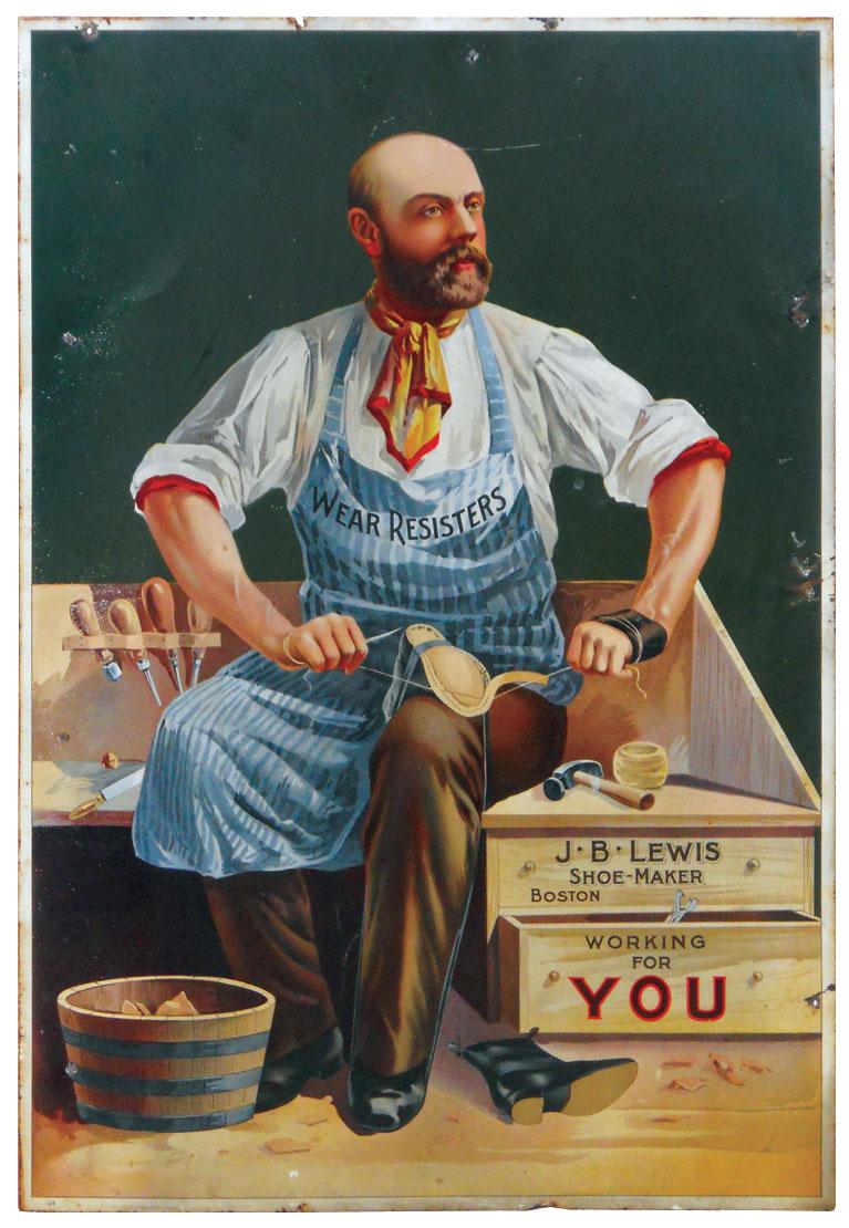 Shoe Maker sign, "Wear Resisters" from J.B. Lewis Shoe-Maker, Boston, colorful litho on metal sign w