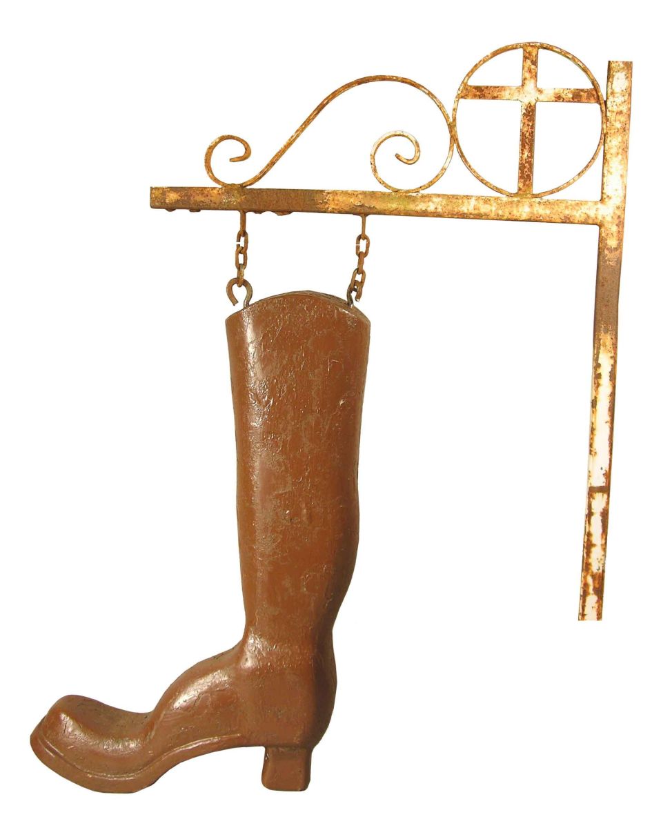 Shoe Repair Trade Sign, wood. Several repaints and rusty original bracket. Boot measures 30 inches tall.