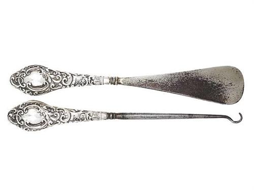 Metal, pressed neo-rococo silver handles. Slightly dented. Marked: Chester, 1904. LENGTH: 22 cm