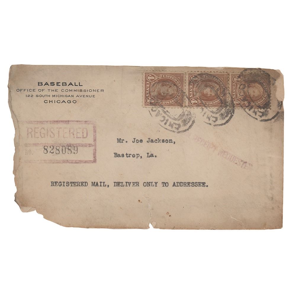 Registered mailing envelope from the “Baseball Office of the Commissioner,” 6.25 x 3.75, sent by Kennesaw Mountain Landis to Shoeless Joe Jackson, addressed in type to “Mr. Joe Jackson, Bastrop, La.,” postmarked on June 21, 1923, in Chicago, Illinois. In very good condition, with toning, edge tears, and paper loss.