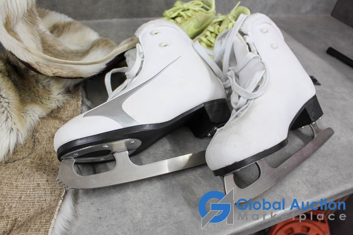 Size 6 Nike Runners; Size 8 Figure Skates; Size 8 Sanouk Flip Flops; Black Boots (No size - Measure approx. 10") Faux Fur Vest & Detached Hood