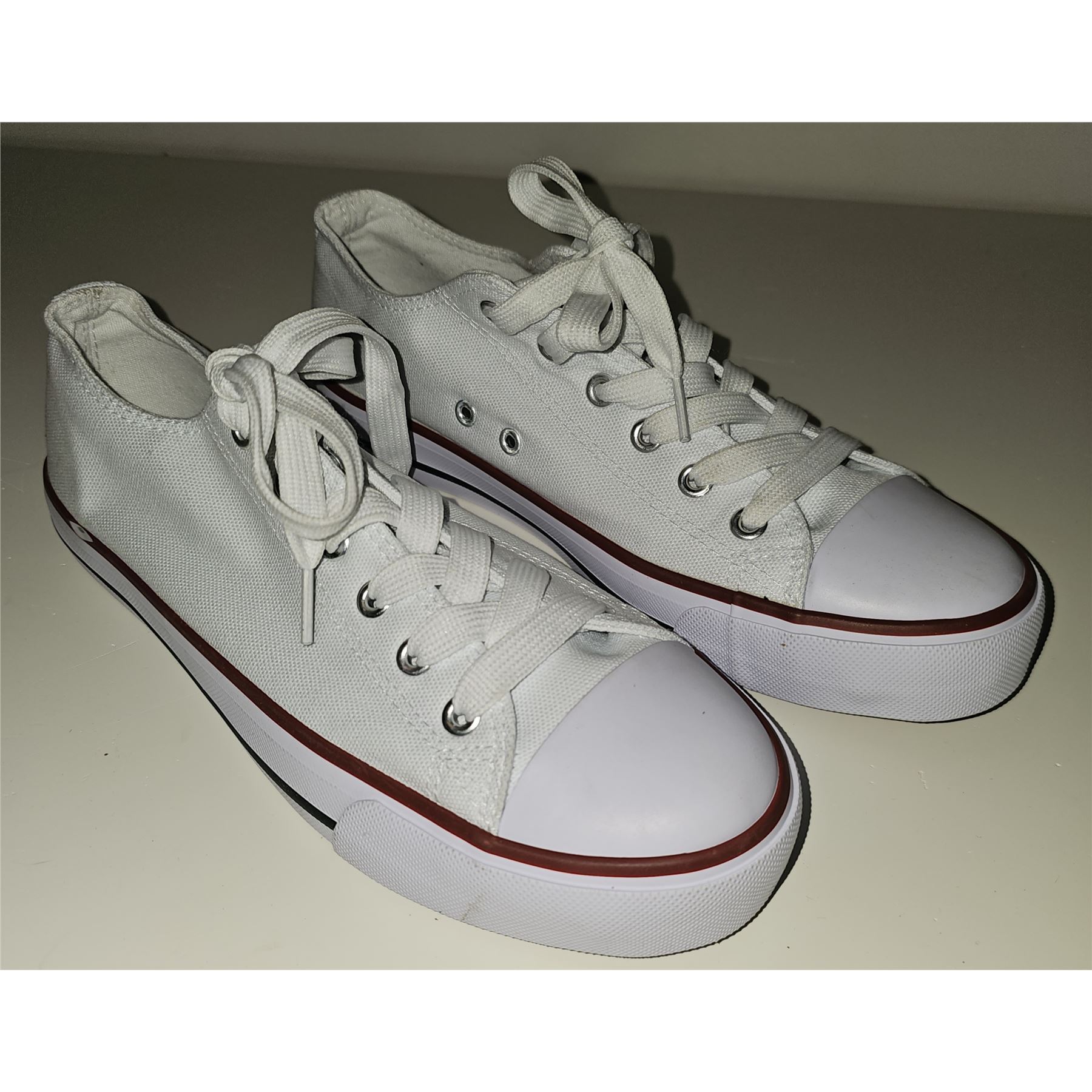 Low-top lace-up style, white with red trim, timeless casual footwear, new.