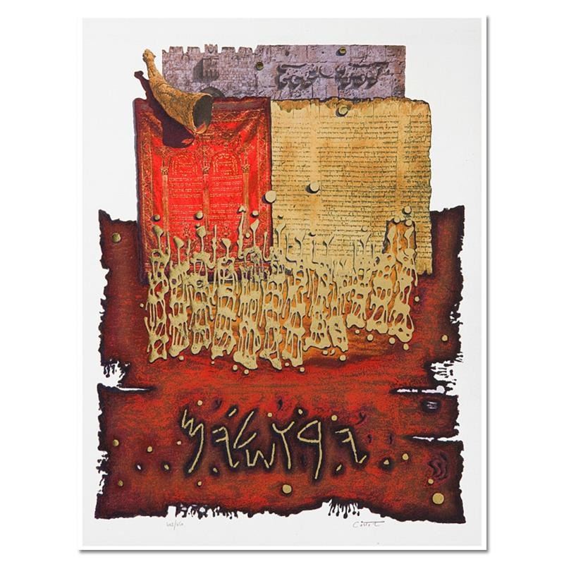 "Shofar above Lion's Gate", is a limited edition Serigraph on Paper by Moshe Castel. Numbered and hand signed, this piece is accompanied by a letter of authenticity. Measures approximately 22.5" x 18" (image).