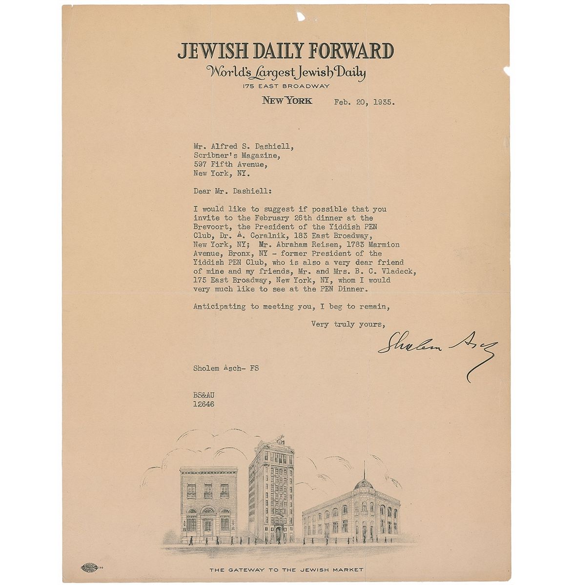 American-Jewish novelist, dramatist, and essayist (1880–1957). TLS, one page, 8.5 x 11, illustrated Jewish Daily Forward letterhead, February 20, 1935. Letter to Alfred Dashiell providing a list of individuals to invite to a dinner. In part: “I would like to suggest if possible that you invite to the February 26th dinner at the Brevoort, the President of the Yiddish PEN Club, Dr. A. Coralnik…Mr. Abraham Reisen…former President of the Yiddish PEN Club.” In very good condition, with intersecting folds, a small hole to top edge, a small tear to right edge, and mild overall toning.
