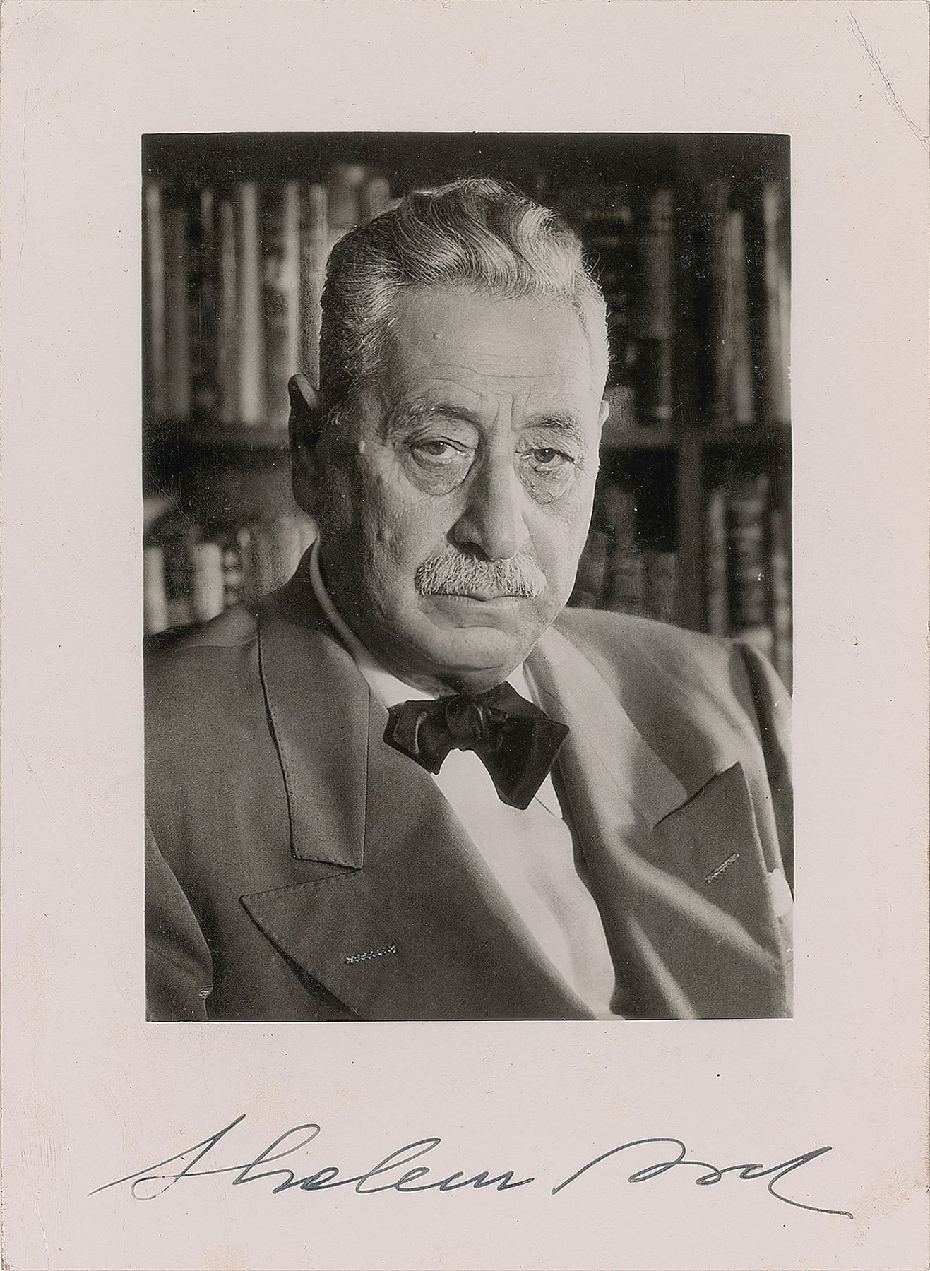 American-Jewish novelist, dramatist, and essayist (1880–1957). Glossy 5 x 7 bust portrait of Asch in his library, neatly signed in the lower border in fountain pen. In fine condition, with light scattered surface crazing, and a crease to the upper right corner tip.