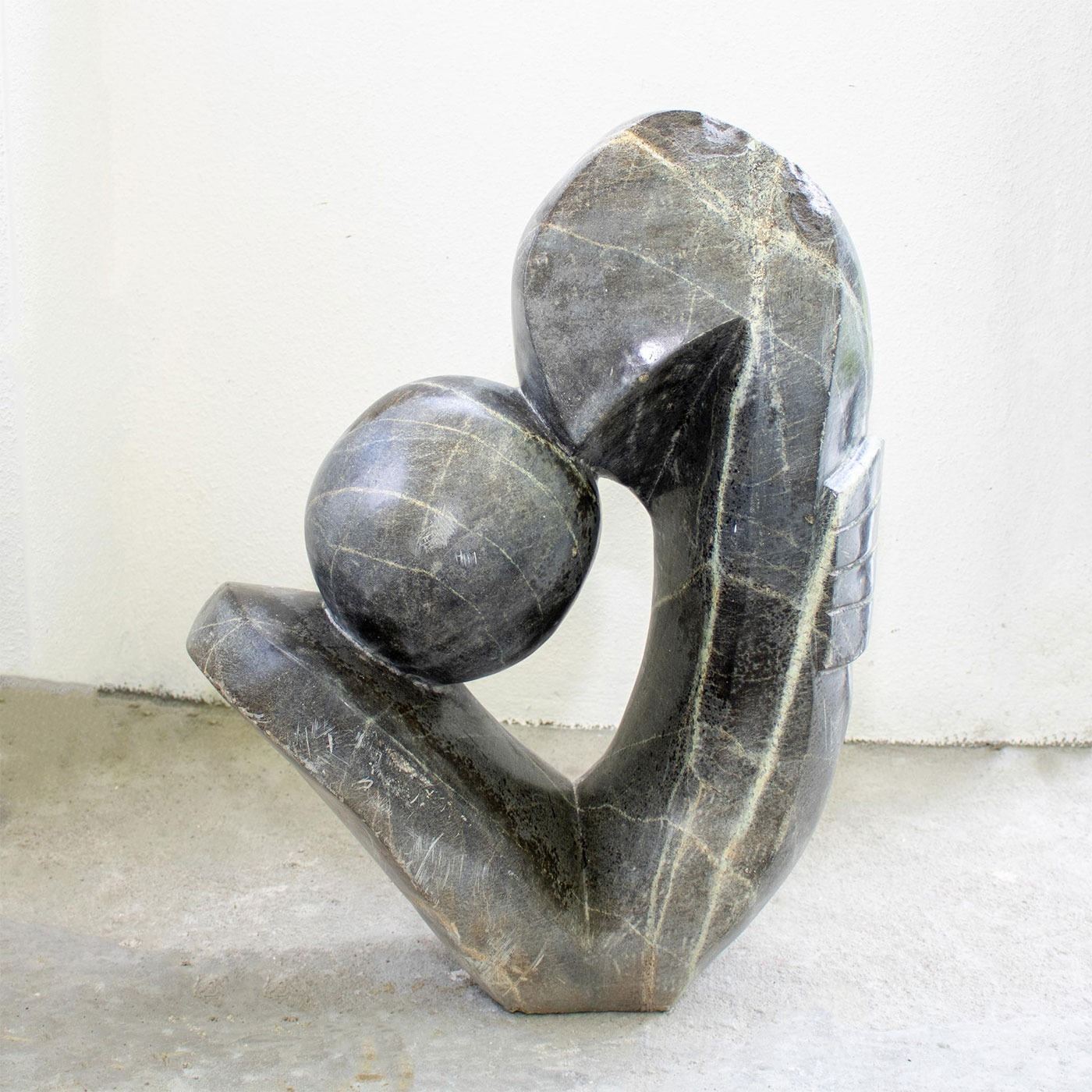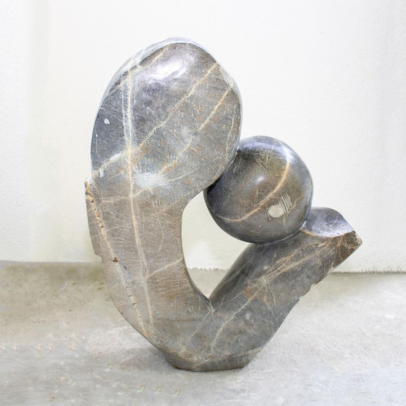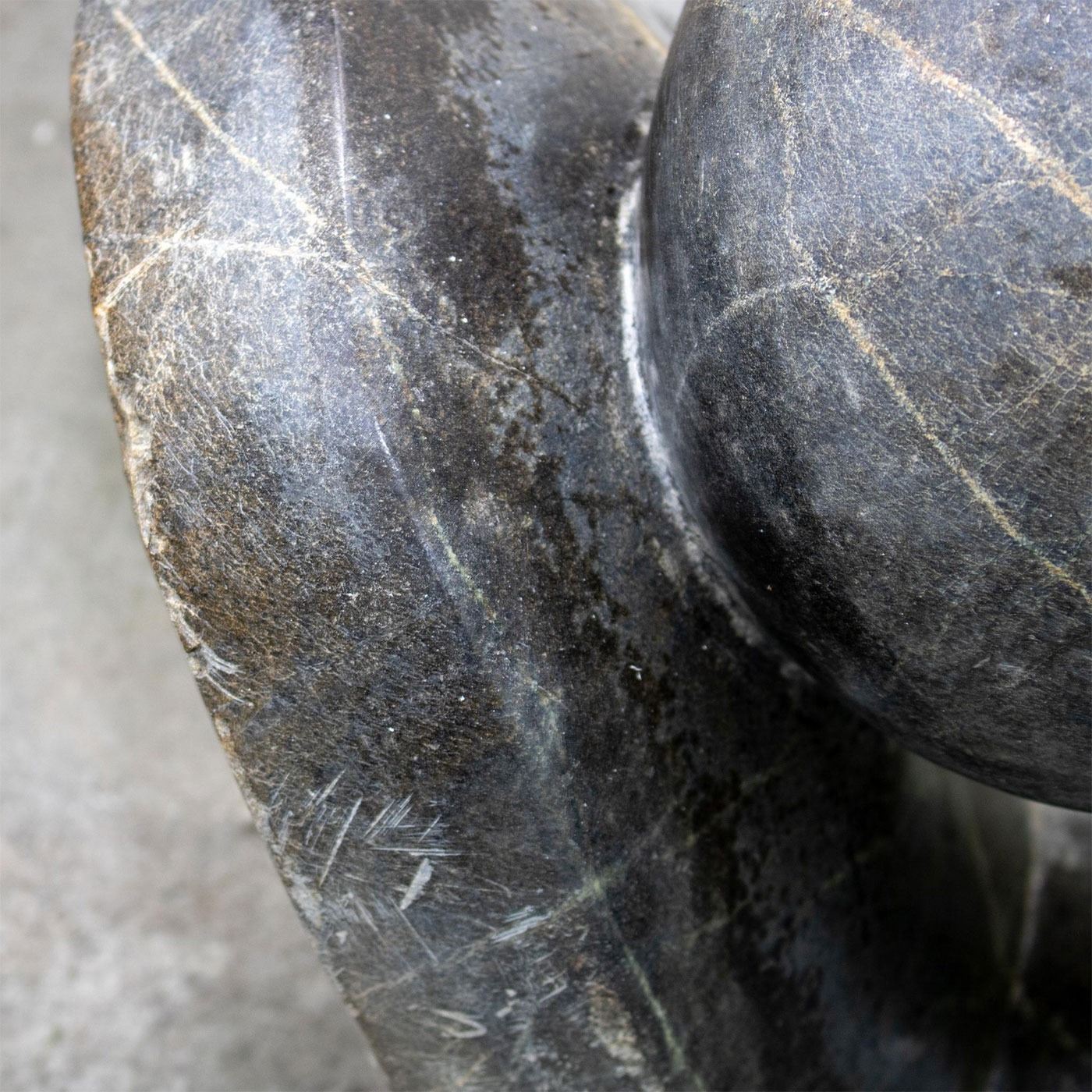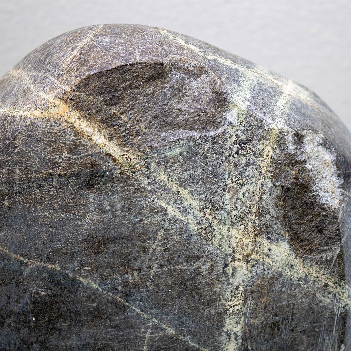 Traditional stone sculpture created by Shone tribe in Zimbabwe, Africa. Beautiful grey coloration with hint of yellow-white lines. Modern Shona sculpture is an evolution of this tradition, which begun in the mid 1900s as an emerging artistic movement. The refreshing design and traditional approach of Shona sculptors make their works popular and attractive to collectors. Some chipping damages (3"W) on the top of the sculpture. Some minor scratches on the surface. Heavy solid stone sculpture. #shona #africanart #Zimbabwe