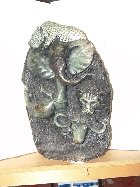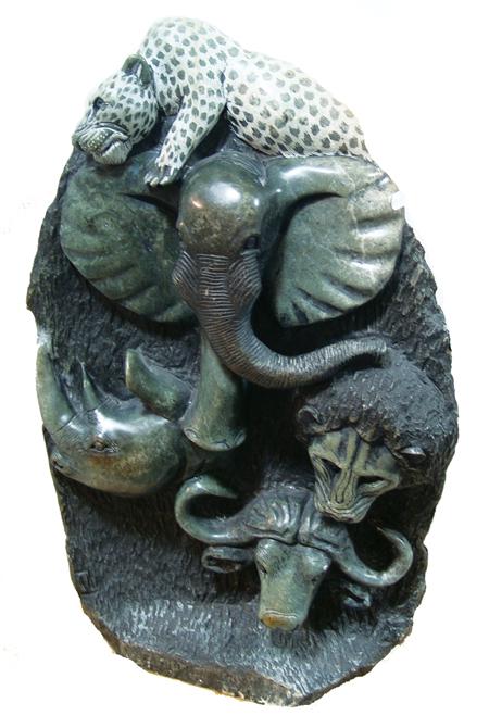 Circa Late 1900s, Large beautifully carved stone sculpture representing the "Big Five" animals; elephant, leopard, rhinoceros, lion and water buffalo. Very good condition. Additional shipping charges may apply. 25" x 15"