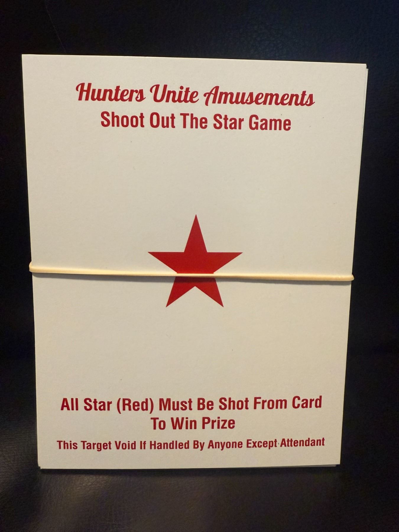 “Shoot Out The Star” target game cards Good for .22 target shooting. These heavy cardstock targets feature a bold red star in the center. Reverse side is blank.