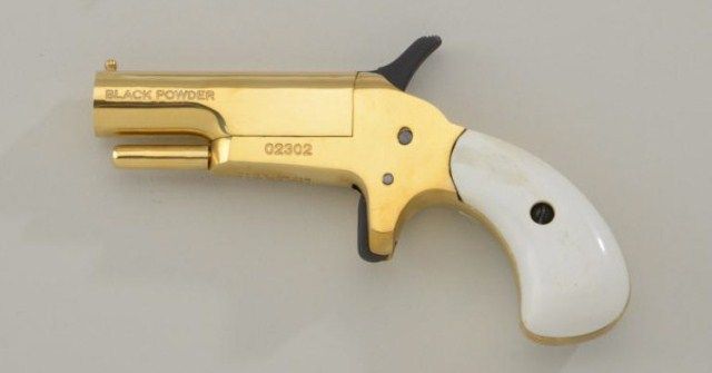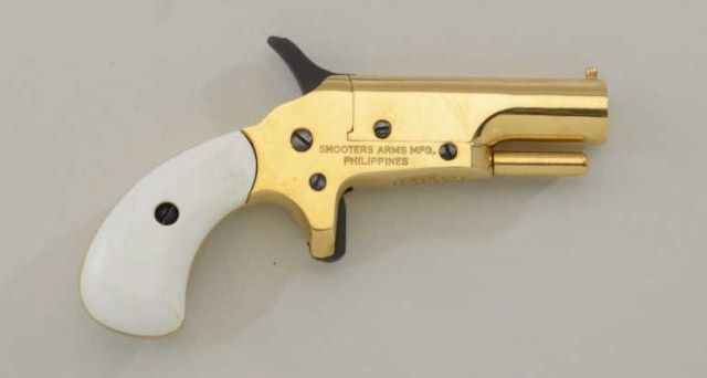 Shooters Arms copy of a single shot derringer percussion blackpowder, made in the Philippines, brass frame and barrel, faux ivory grips, .22 cal., #02302. Est.: $30-$60.