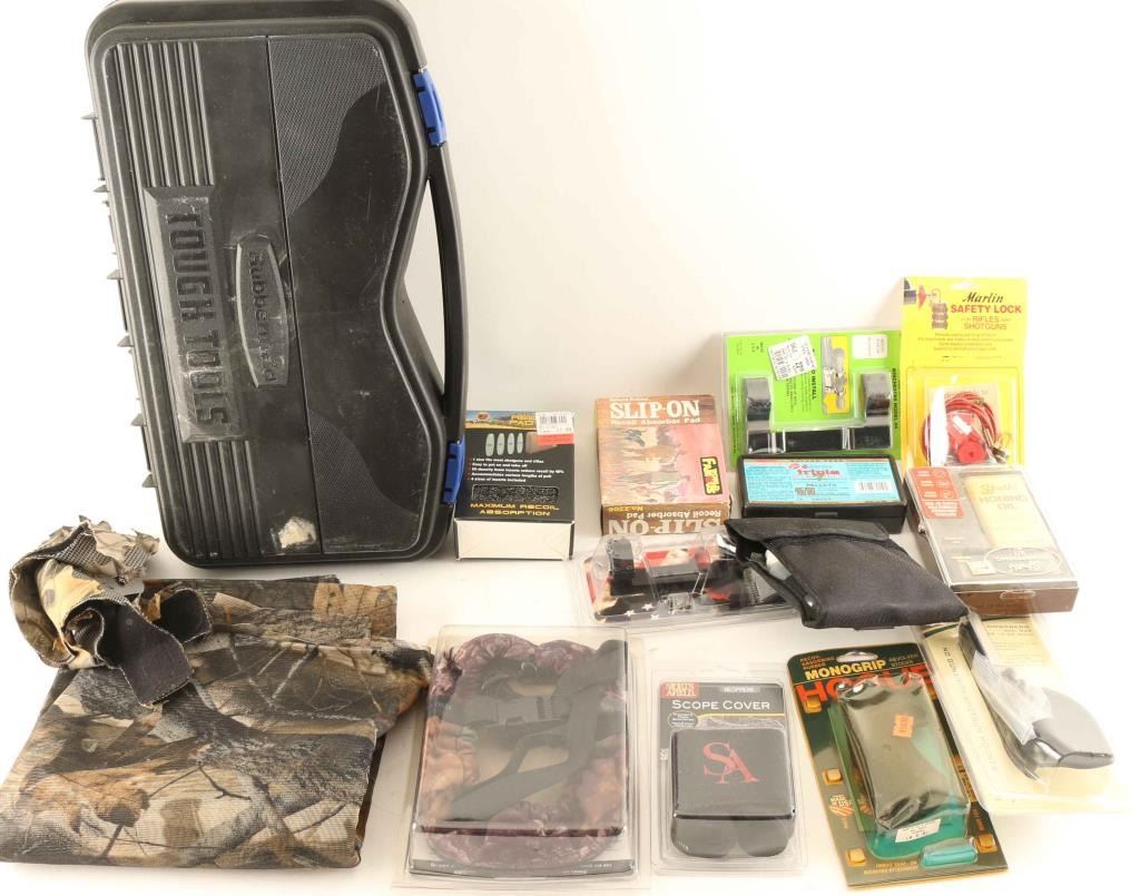 Including; plastic case with reloading items, safety locks, triple seven pellets, bino shield, side mount, scope covers, shotgun mounts, recoil pad kit and more.