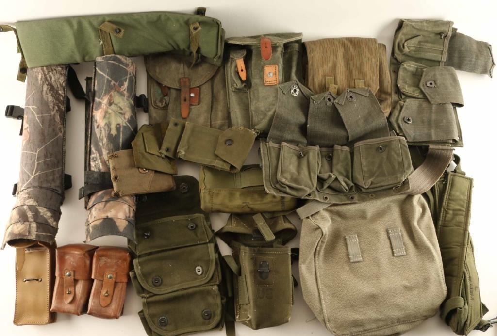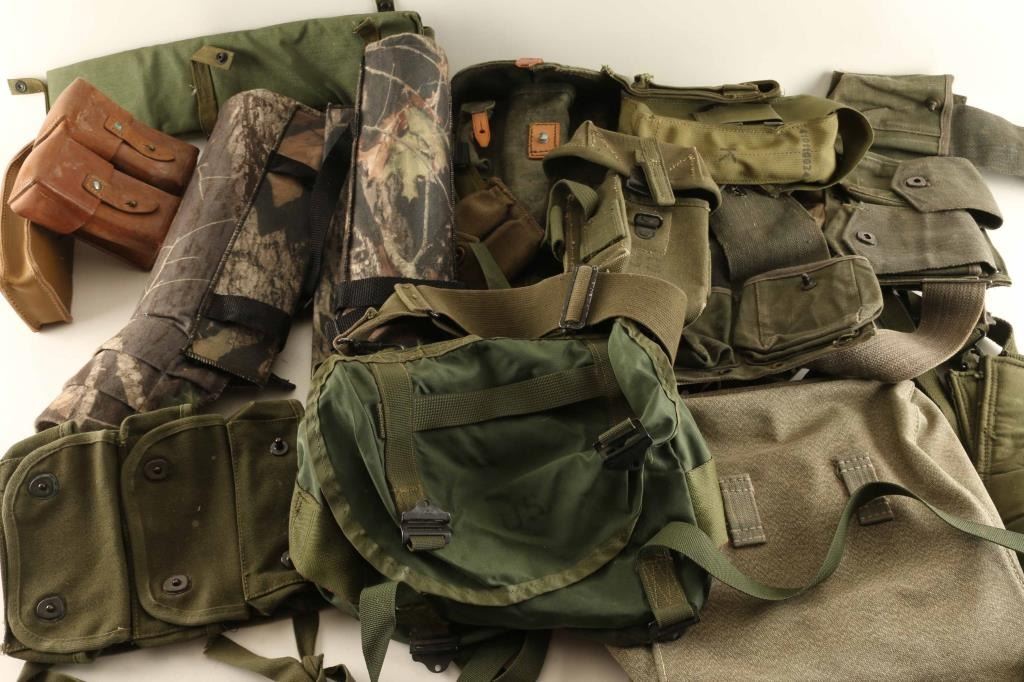 Green Canvas belt and pouches, Suspenders field pack combat size Large, many canvas pouches marked "US", A pair of Snake Guardz camo arm sleeves snake proof size Medium, green waterproof pack with strap marked "US", leather ammo pouches/holders,