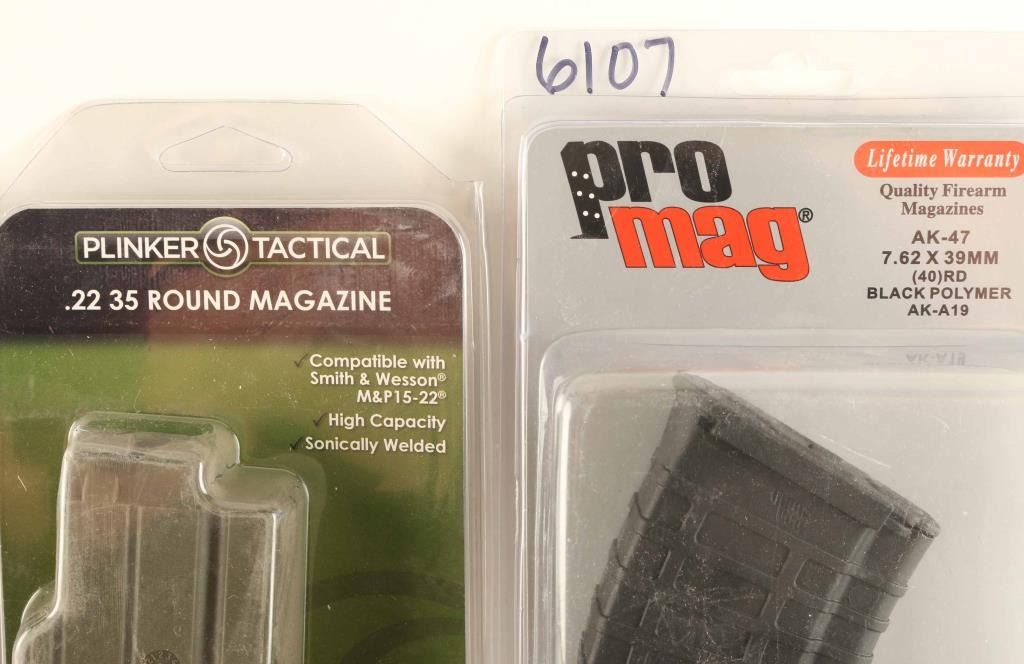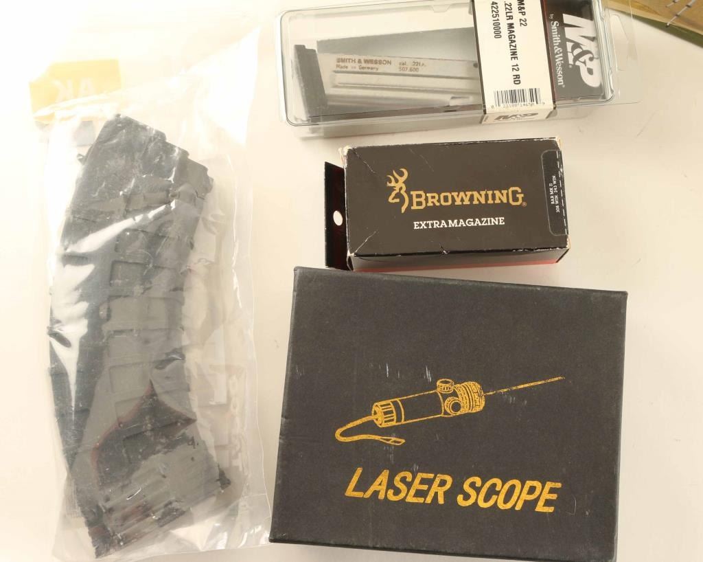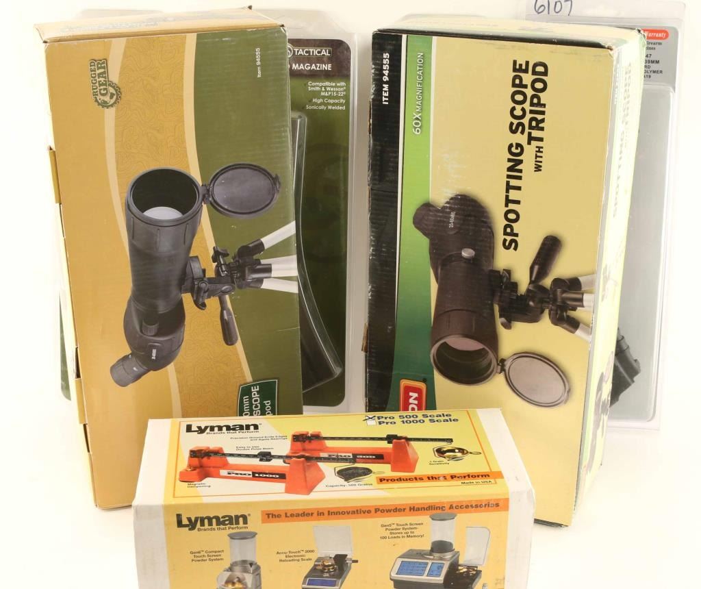 Lot includes Three Plinker Tactical .22LR 35 round mags for the S&W M&P 15-22 in packaging, One 40 round ProMag magazine for AK-47,One Tapco 30 round mag for AK, One Browning BAR MKII 4 round mag in 308/243, One S&W M&P 22 mag, a Lyman Pro 500 scale, One Vlife Laser Scope and extra parts and Two Spotting Scopes with tripods, in boxes. See Photos.