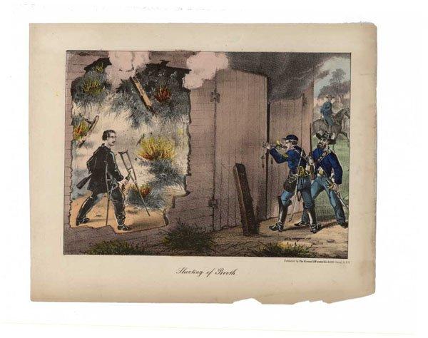 Color Print “Shooting of Booth.” 11 7/8” x 9 1/2”. Published by “Chr. Kimmell & Forster 254 & 256 Canal St. NY.” 1865. The print depicts the moment Sergeant Boston Corbett fired the shot that killed Booth. Unlike many examples of a similar Kimmell & Forster print, the right side of thus print does not show the capture of David Herold. paper loss at lower right, not affecting image or text. Else Extremely Fine