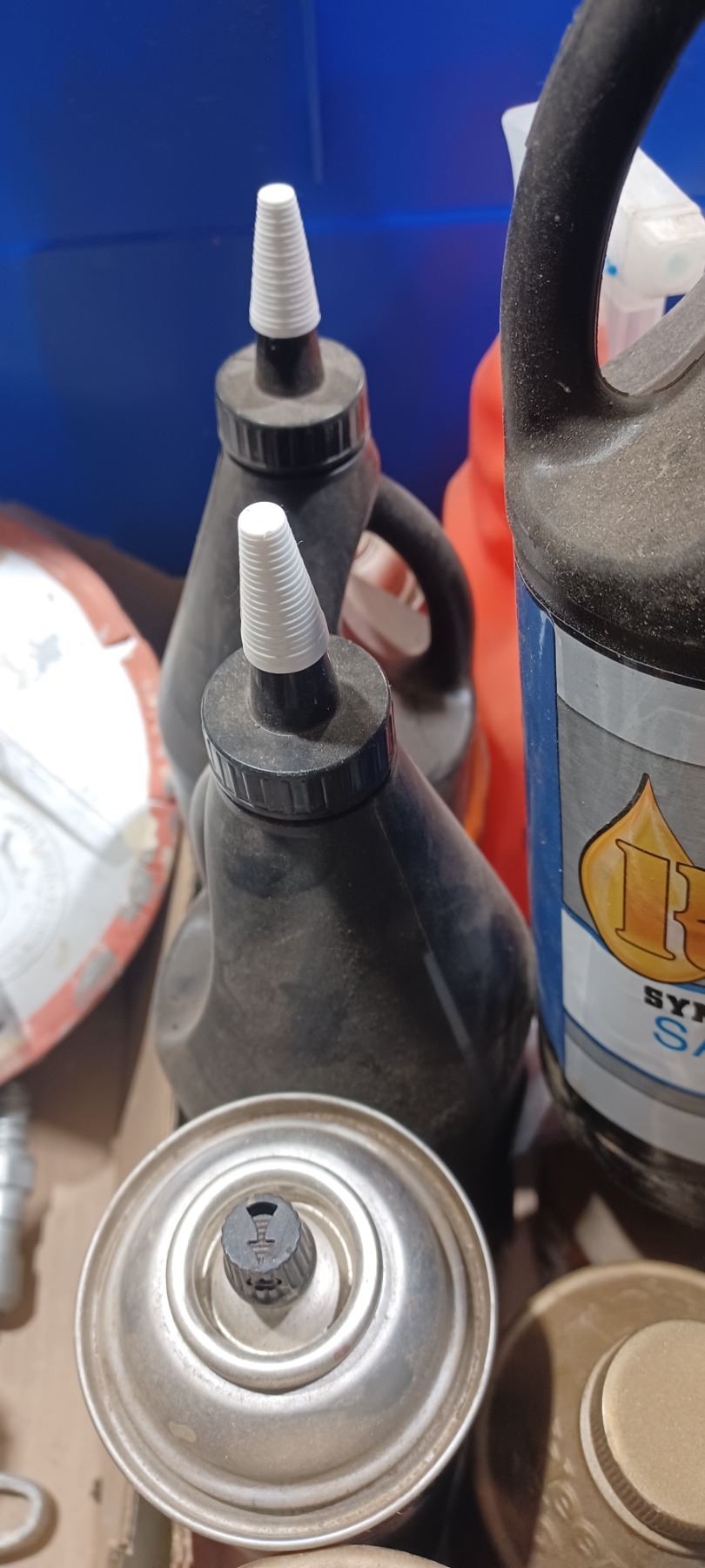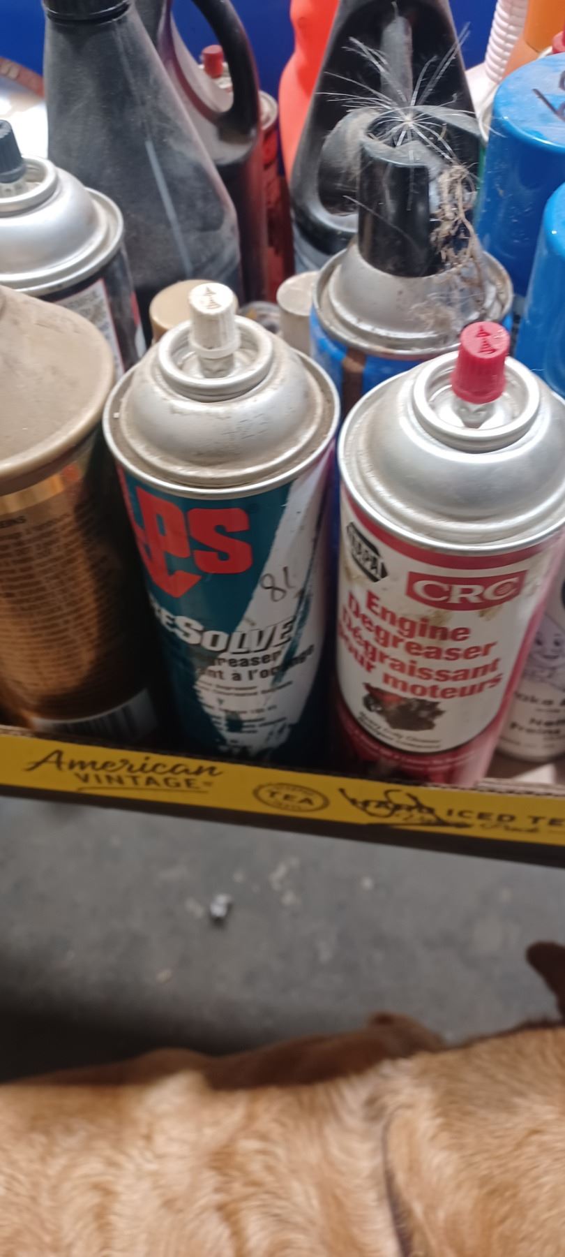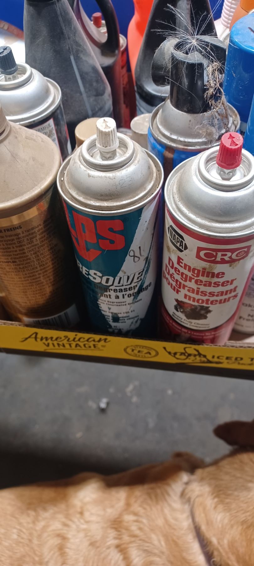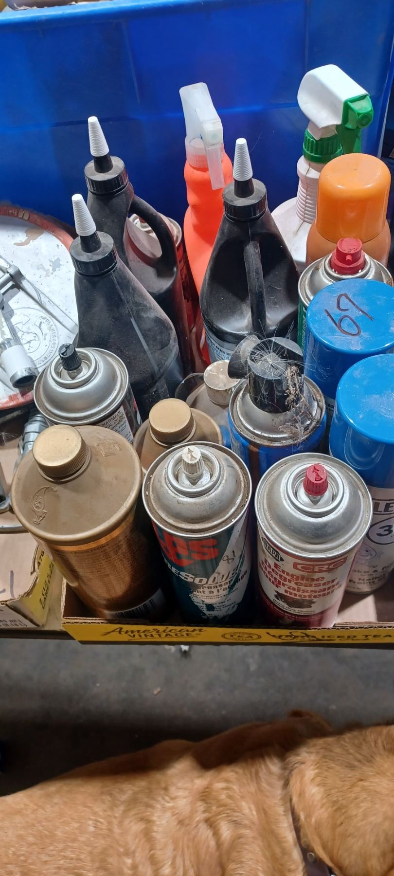 Flat with assorted shop fluids, Brake Fluid, 3 liters of Synthetic Gear oil, Etc.