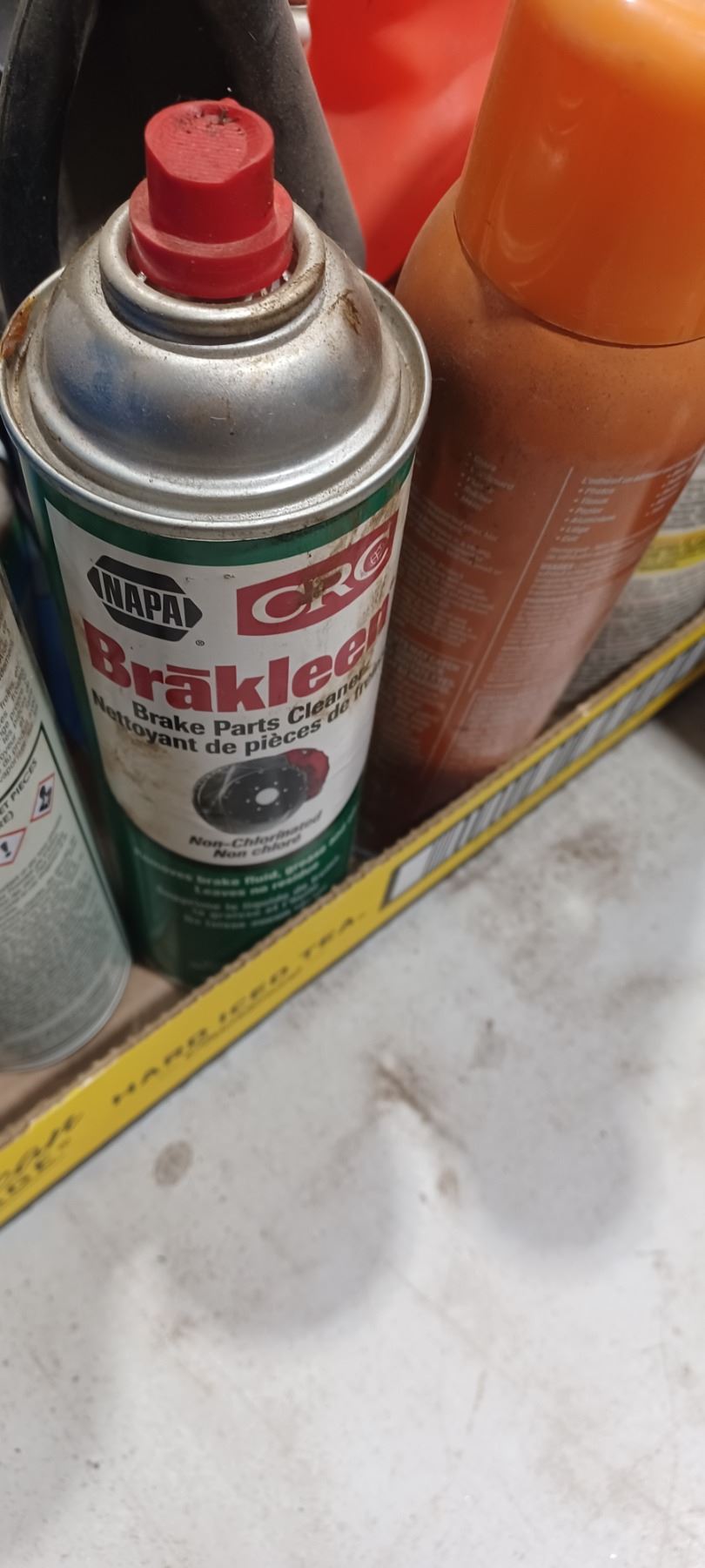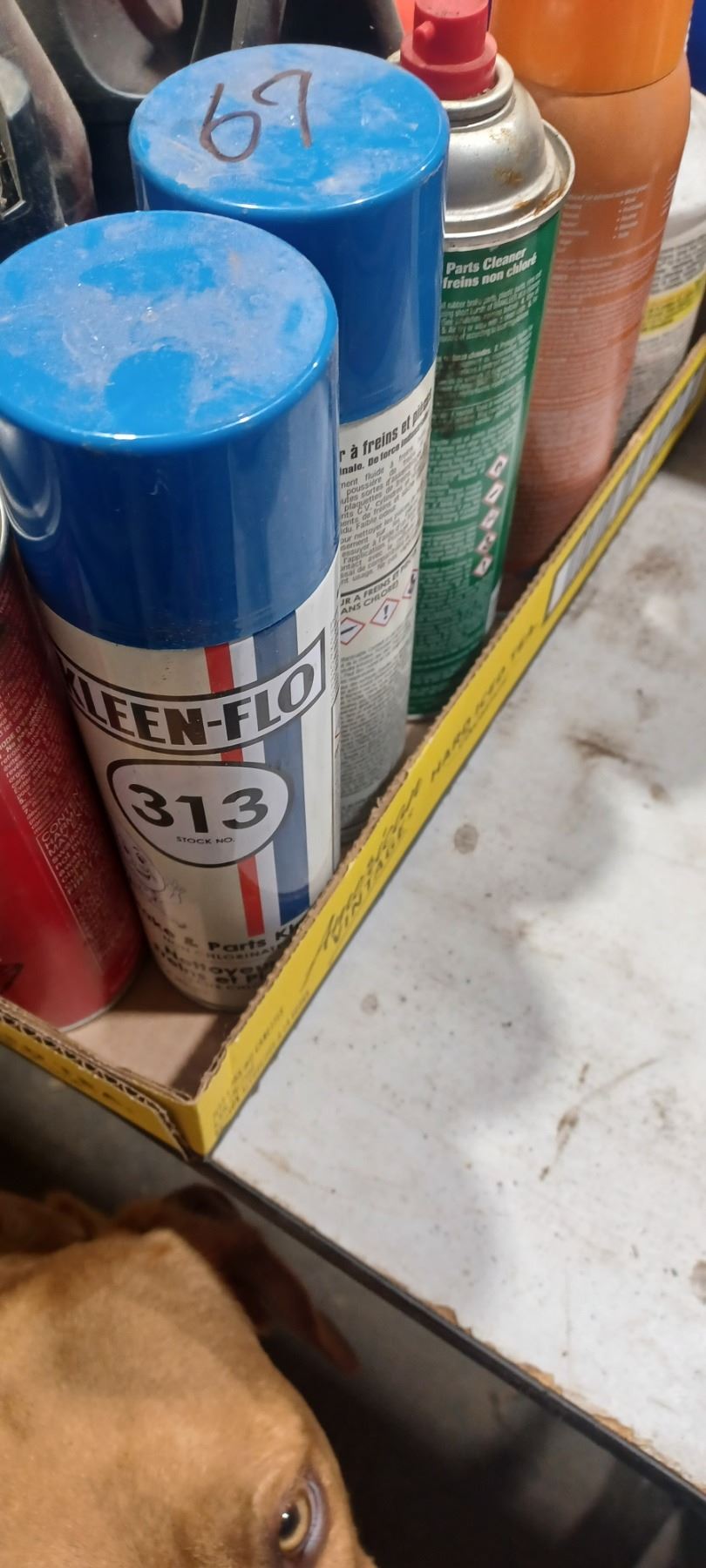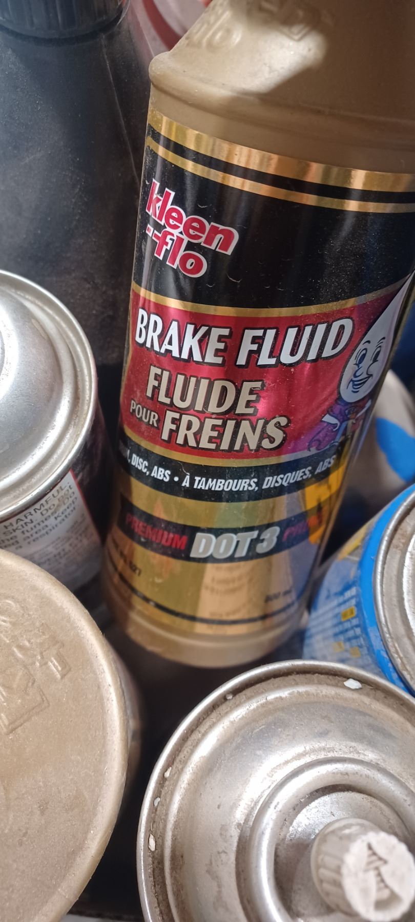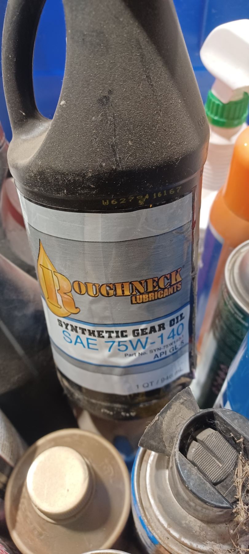 Flat with assorted shop fluids, Brake Fluid, 3 liters of Synthetic Gear oil, Etc.