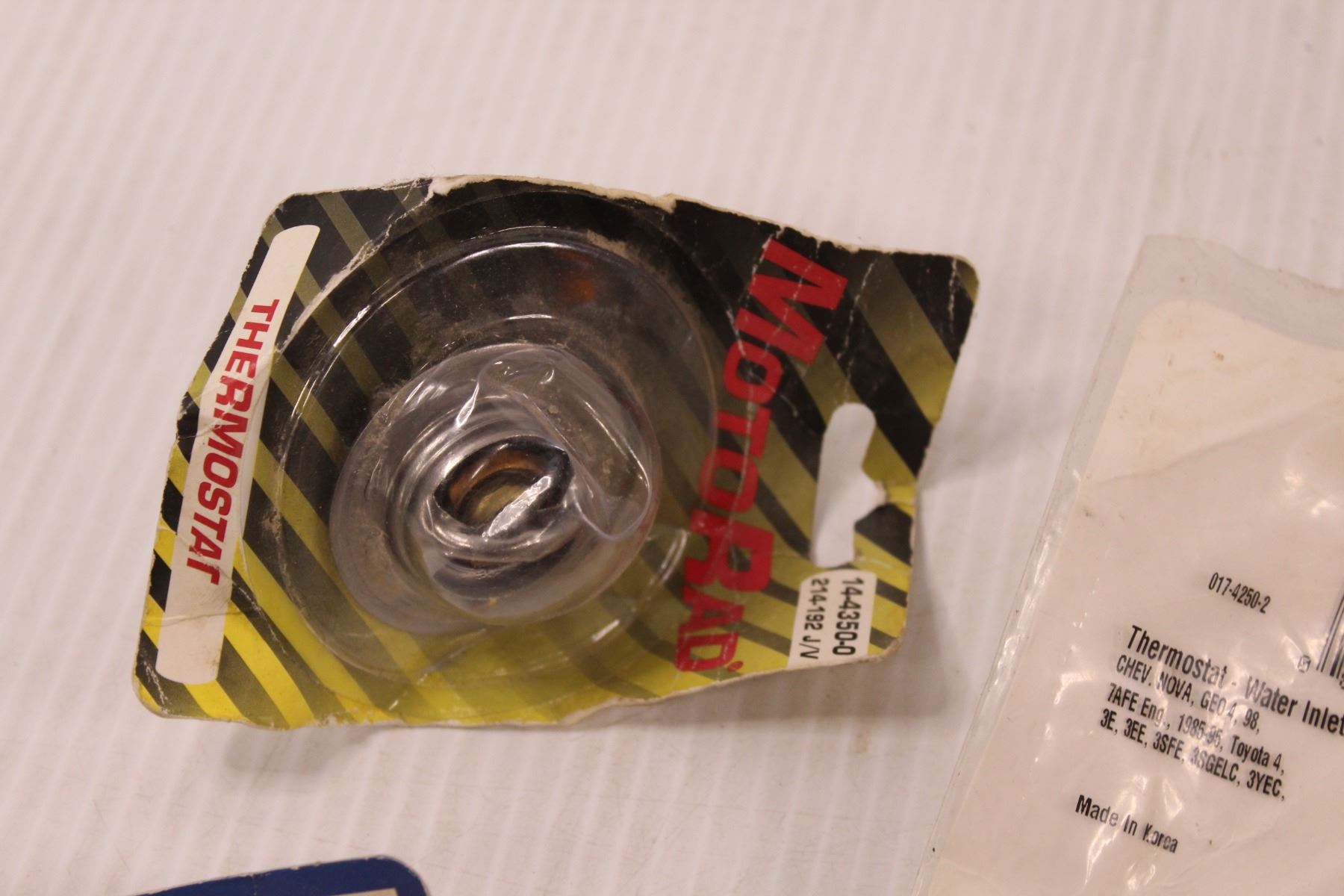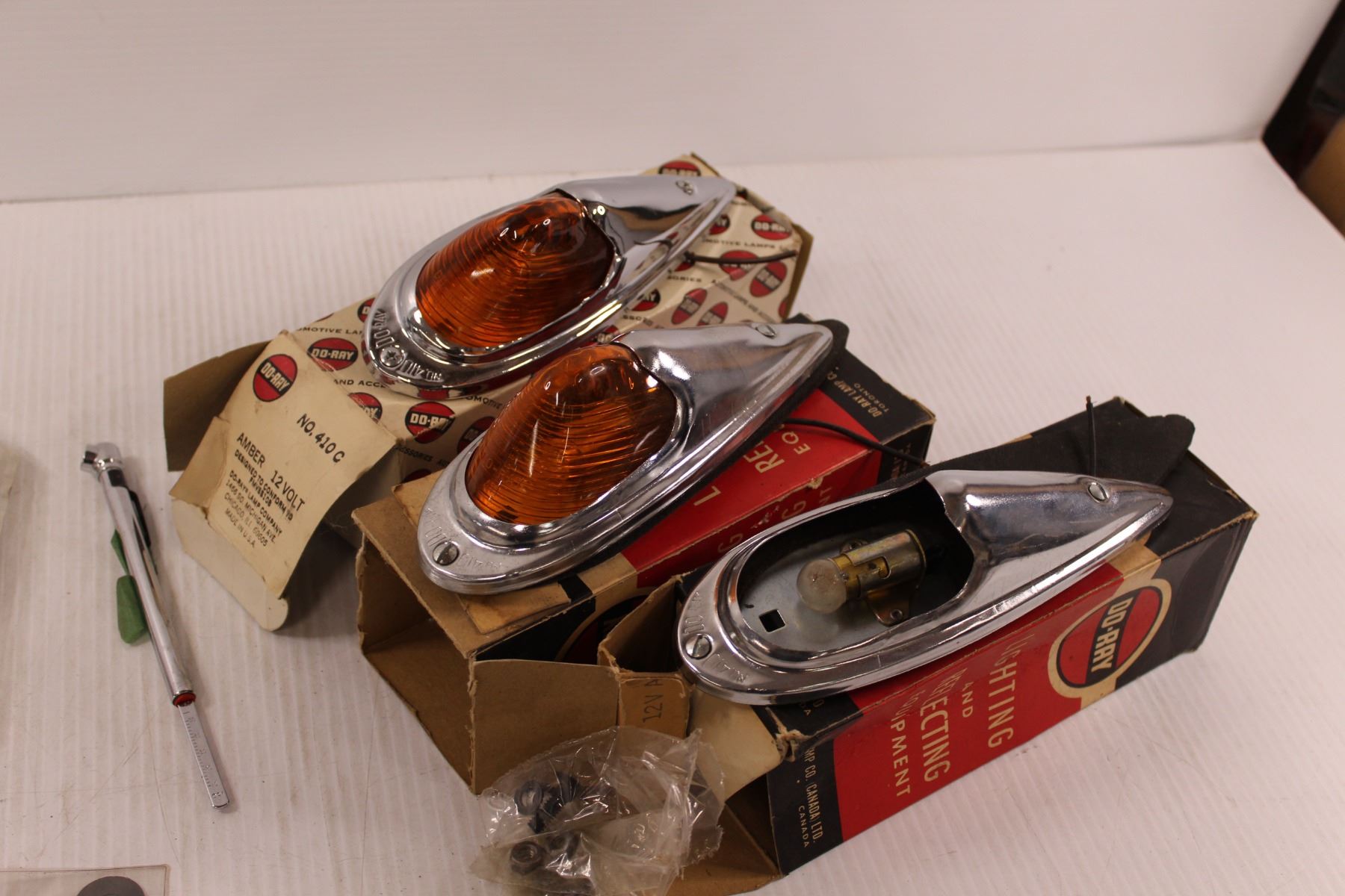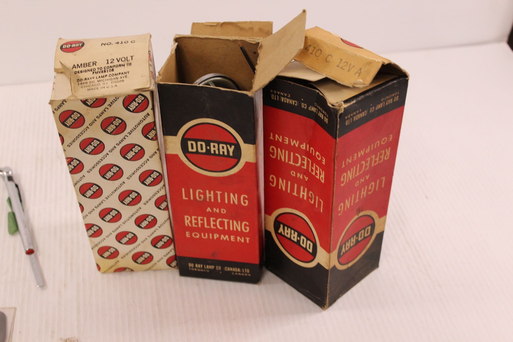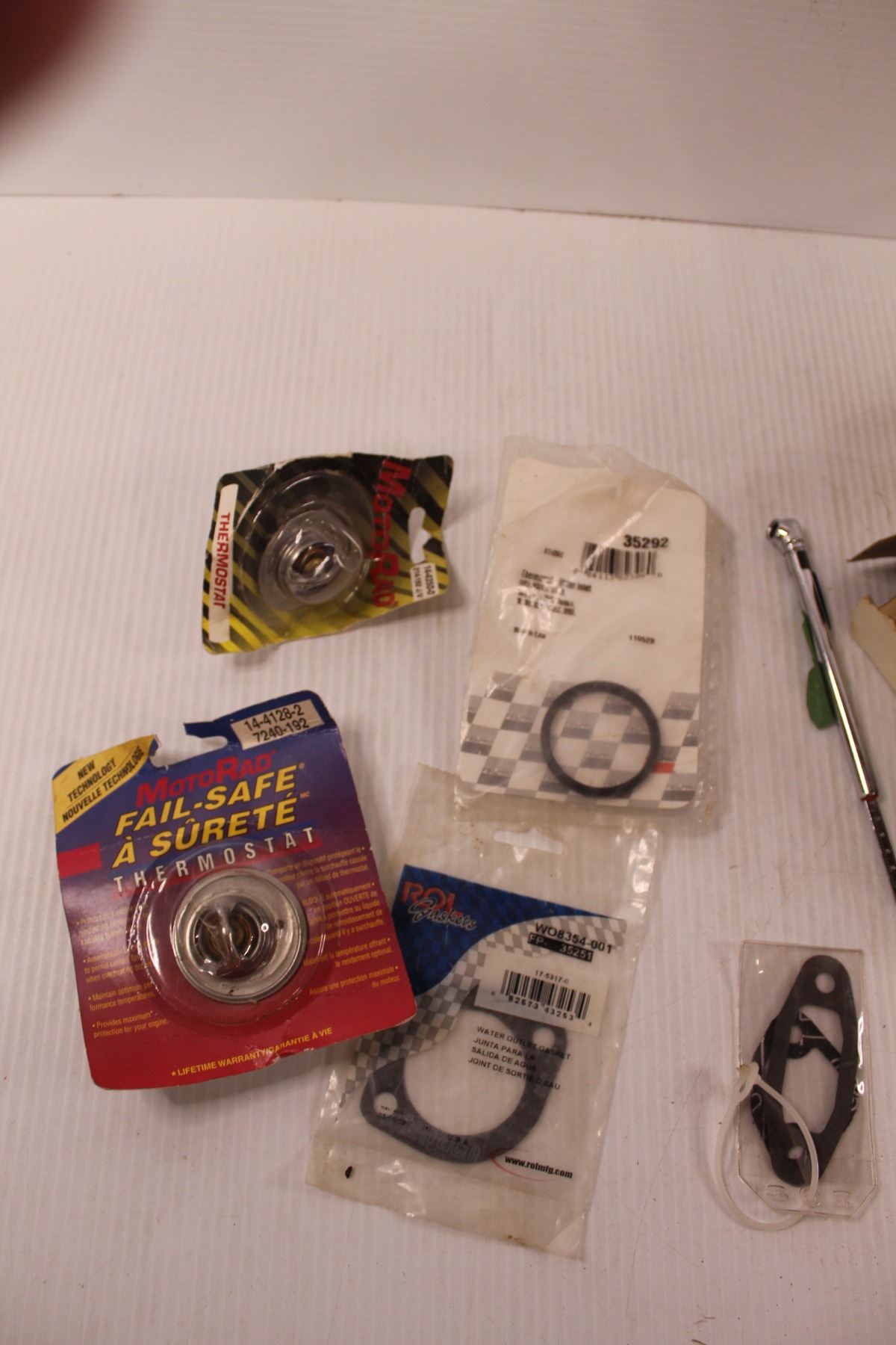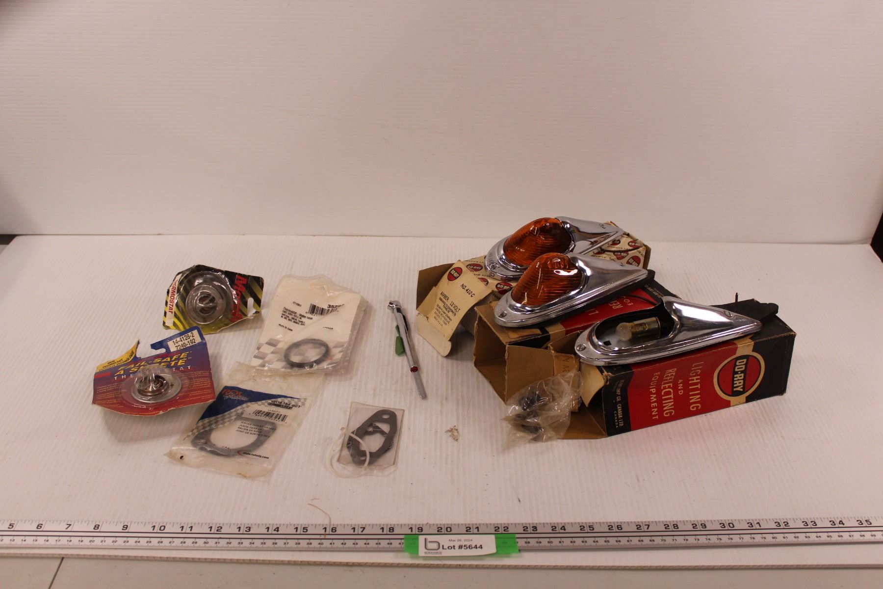 Shop Items - (2) Thermostat's Gaskets, (3) DO-RAY Amber Marker Lights (New Old Stock) 1 Missing Lens & Tire Pressure Gauge