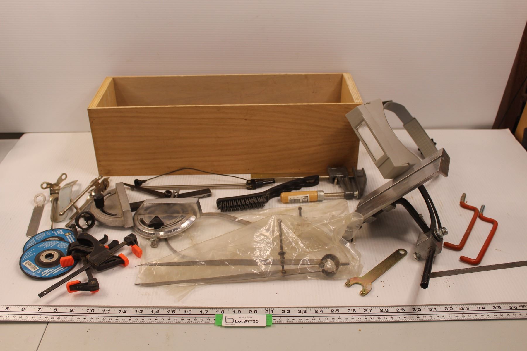 Shop Items - Wire Brush, Bar Clamps, Large Compass, Calipers, Table Saw Guides, Can Openers, 4' Grinding Discs, Grinder Wrenches, Magnafine Glass Headgear etc. w/Wooden Box