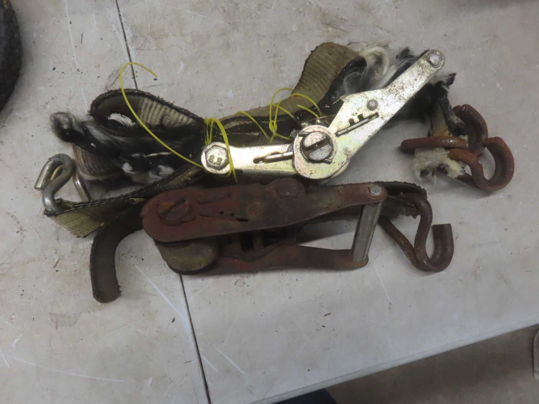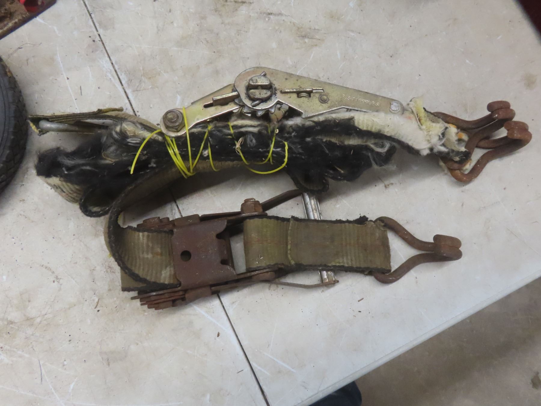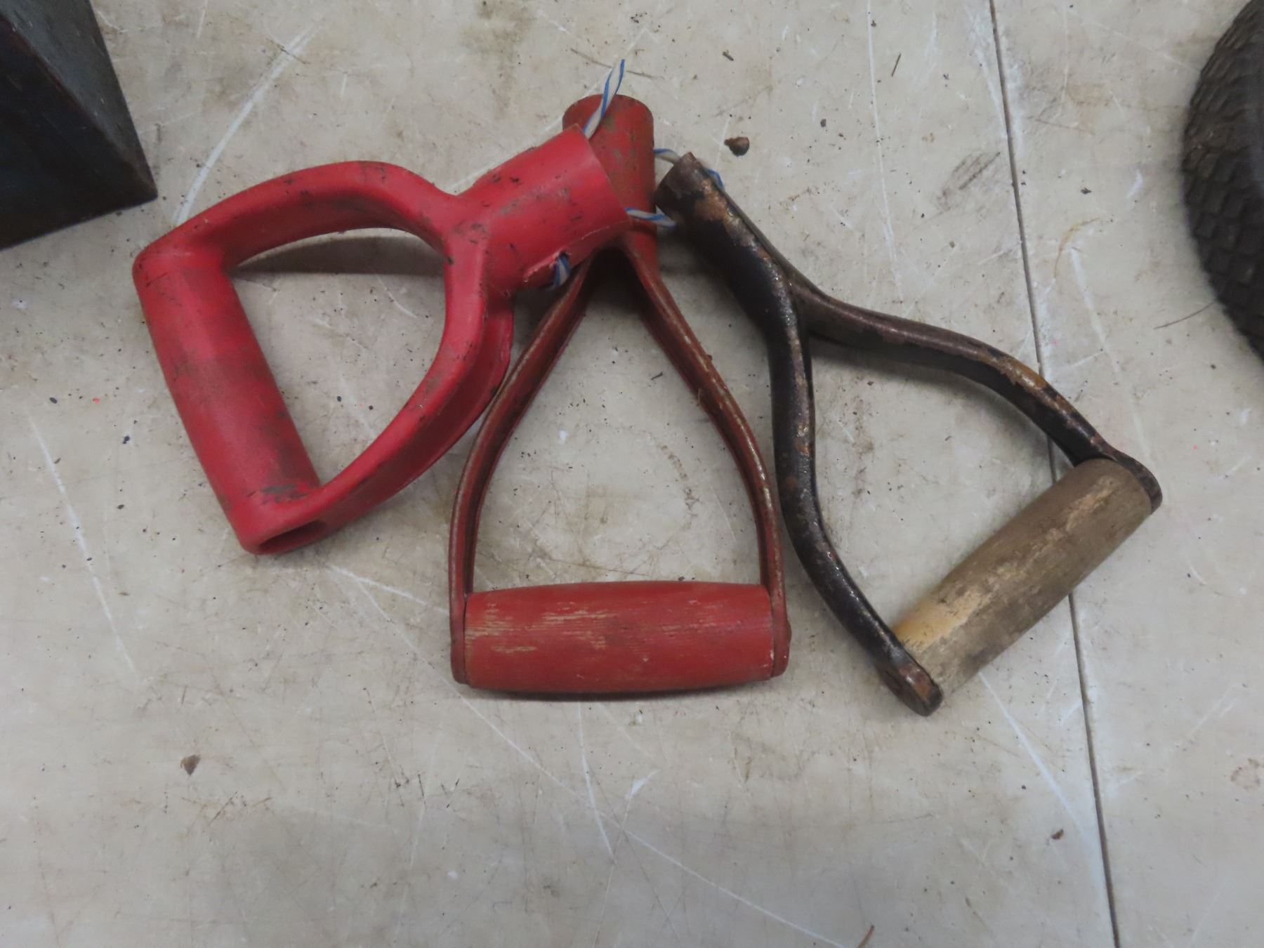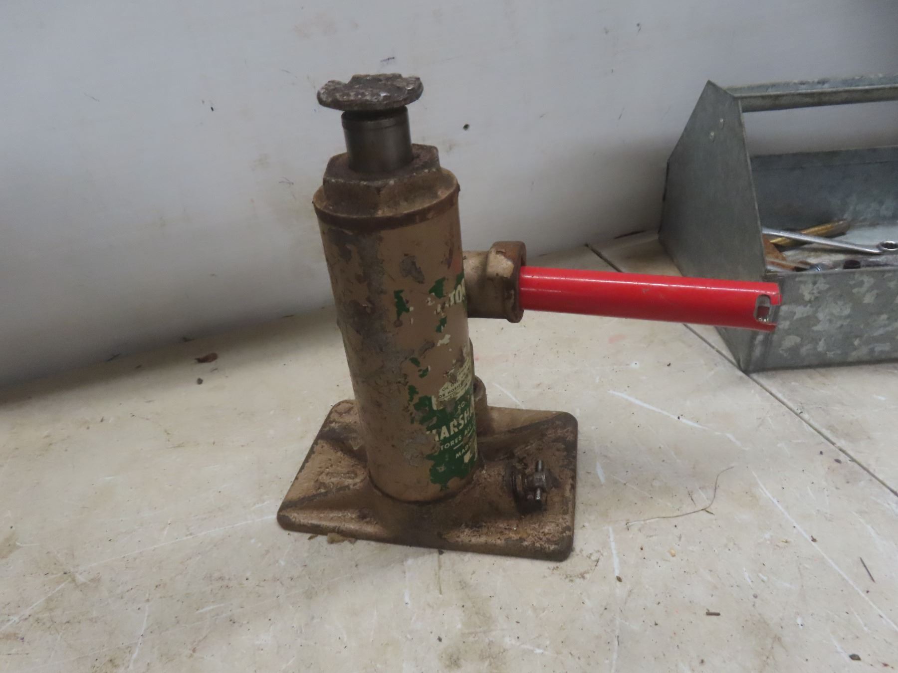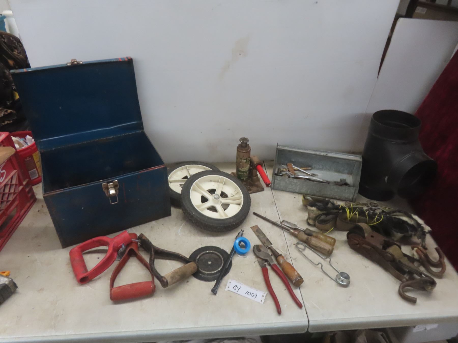 Shop Lot—Metal Toolbox; Hydraulic Jack; Shovel Handles; Ratchet Straps; and 6" T-Pipe, and More.